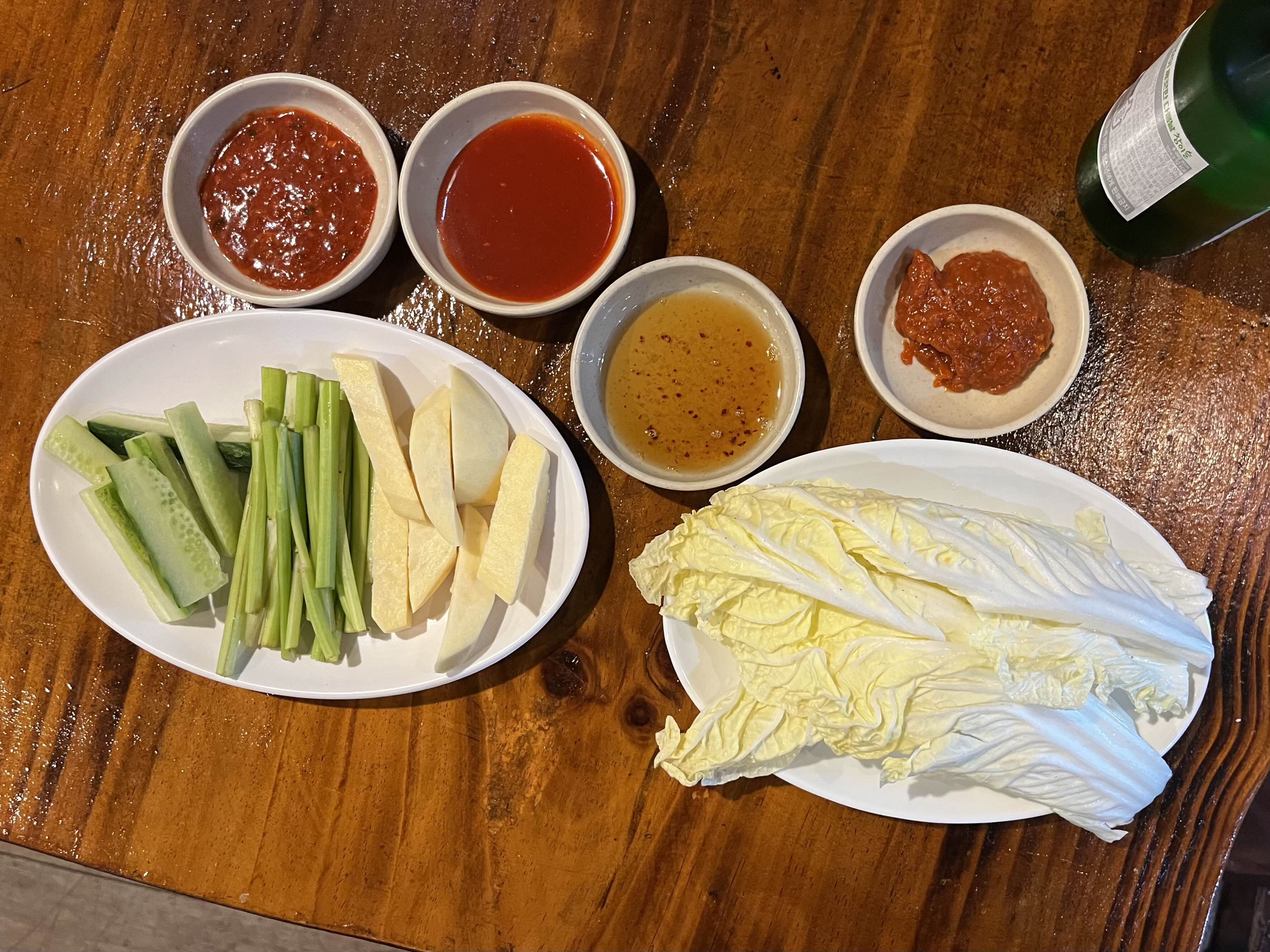 미나리 / 오이 / 생고구마 / 알배추쌈 / 묵은 김치 / 콩나물 / 갈치속젓 / 쌈장 등