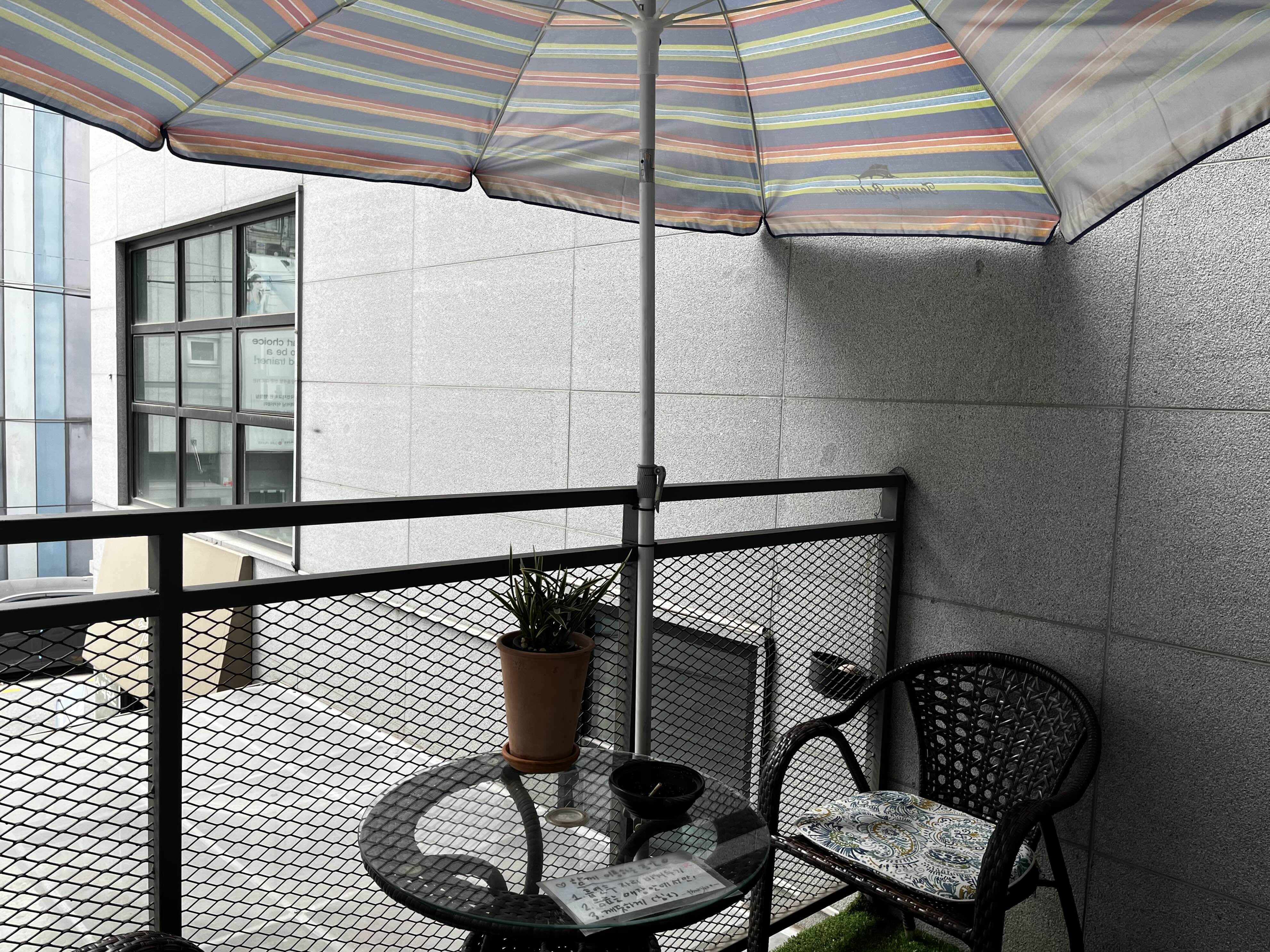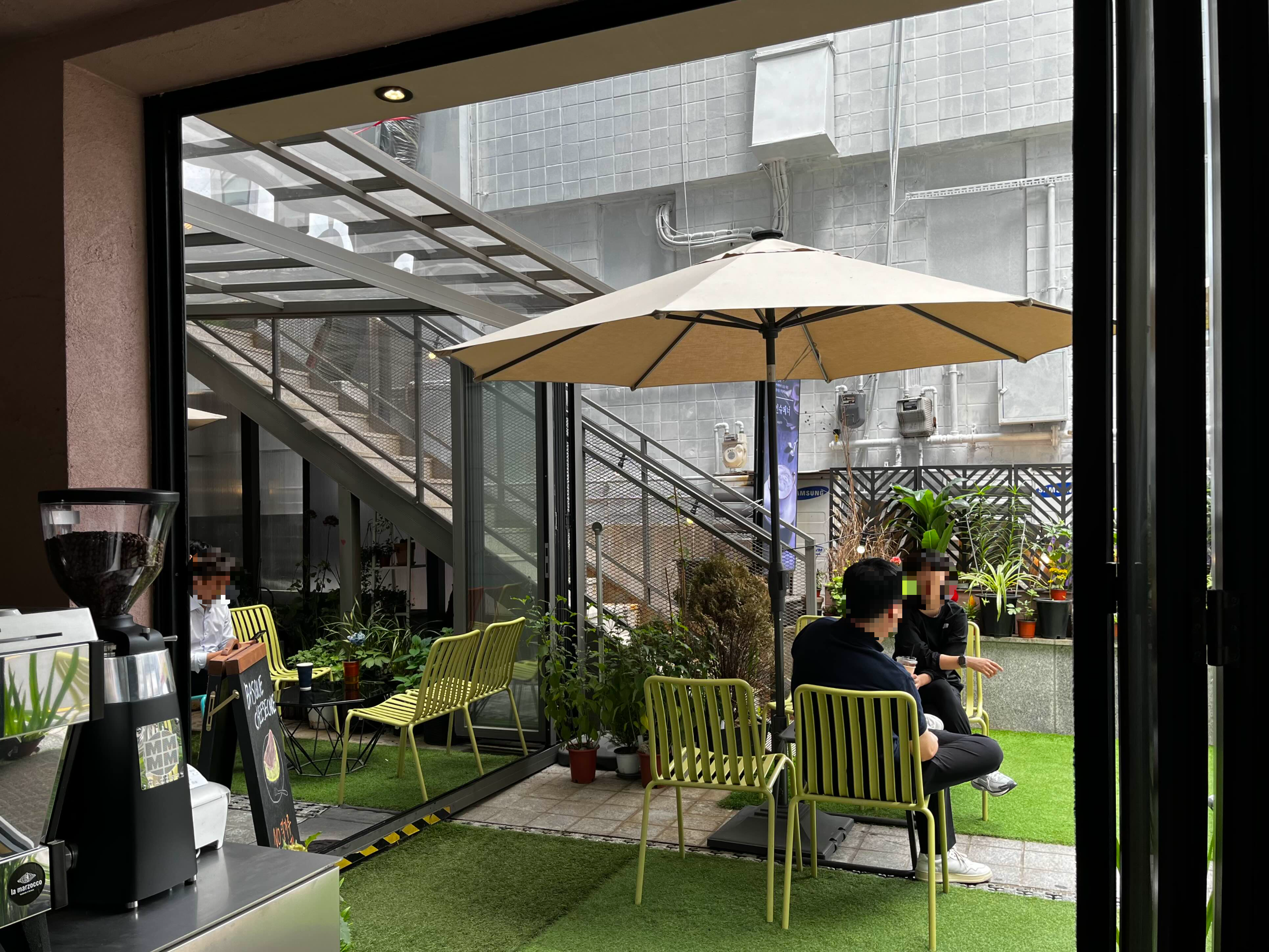 답답한 실내는 싫은데, 햇빛 내리쬐는 야외도 싫으신 분들을 위한 파라솔이 있는 야외 테라스의 테이블⛱️