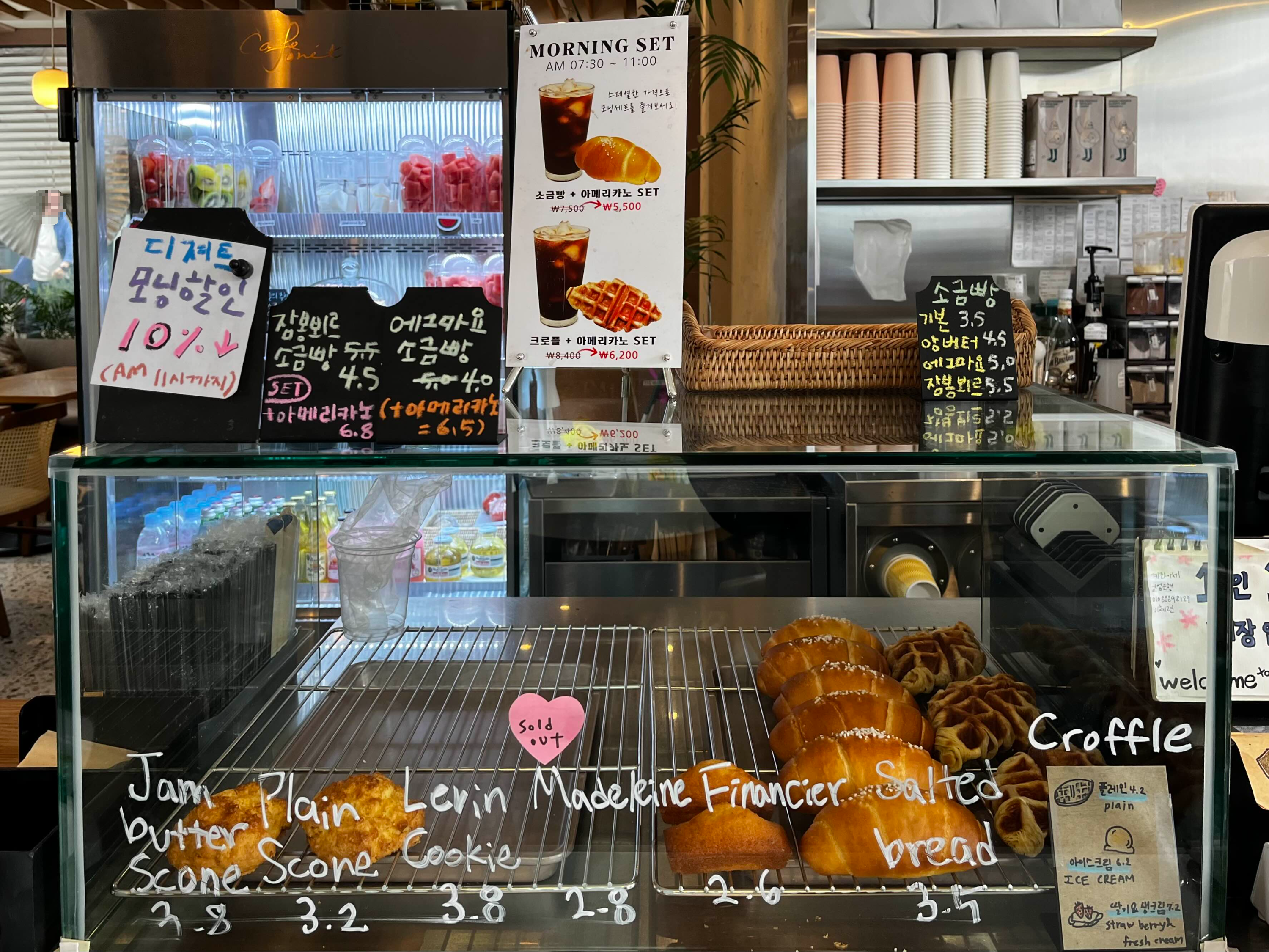음료 외에는 크로플 / 치즈 케이크 / 스콘 / 마들렌 / 소금빵 등 간단한 베이커리 메뉴도 있어요