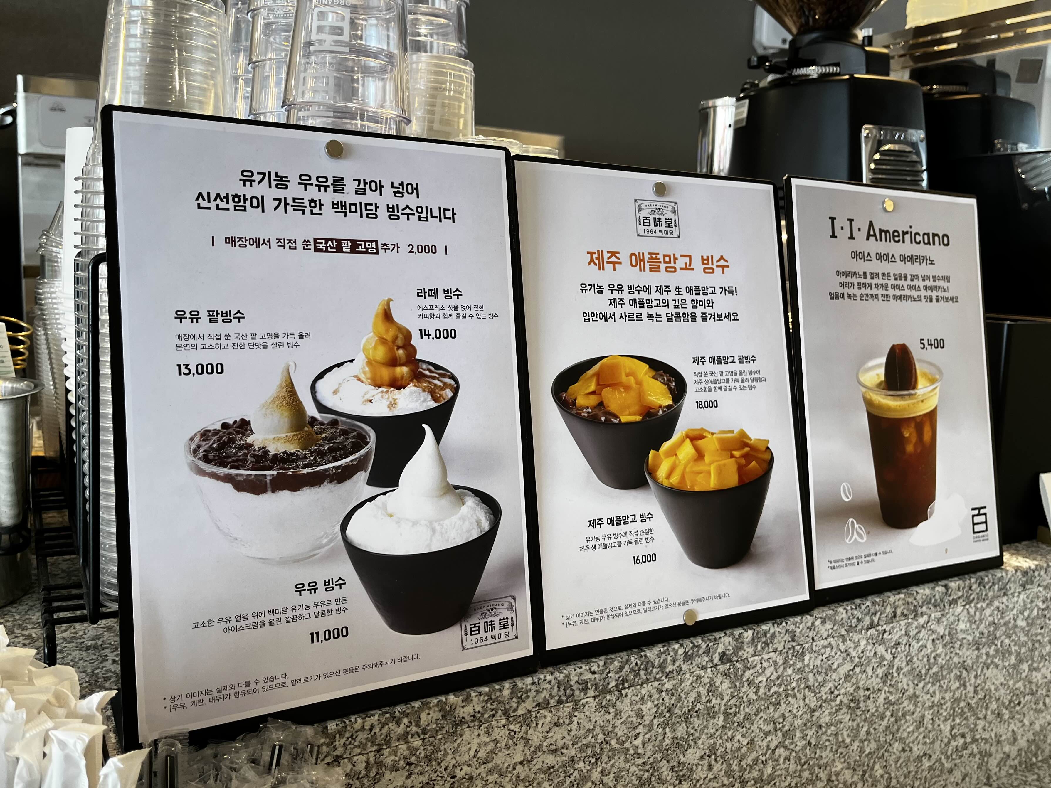 백미당의 빙수는 우유 팥빙수 / 우유 빙수 / 라떼 빙수 / 제주 애플망고 빙수