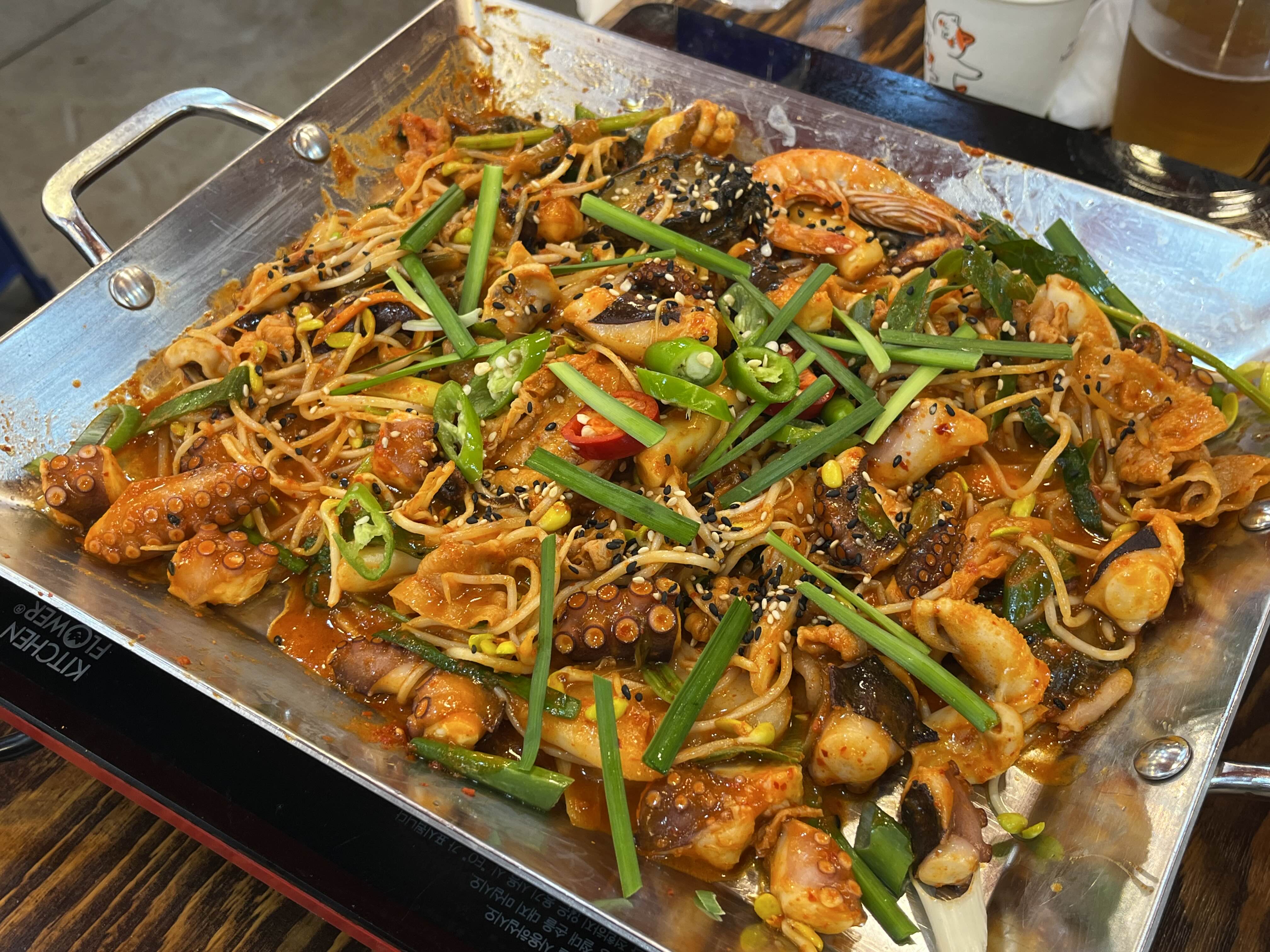 고기 / 돌문어 / 전복 / 새우 / 콩나물 등 다양한 속재료와 매콤한 양념이 들어가는 볶음요리예요