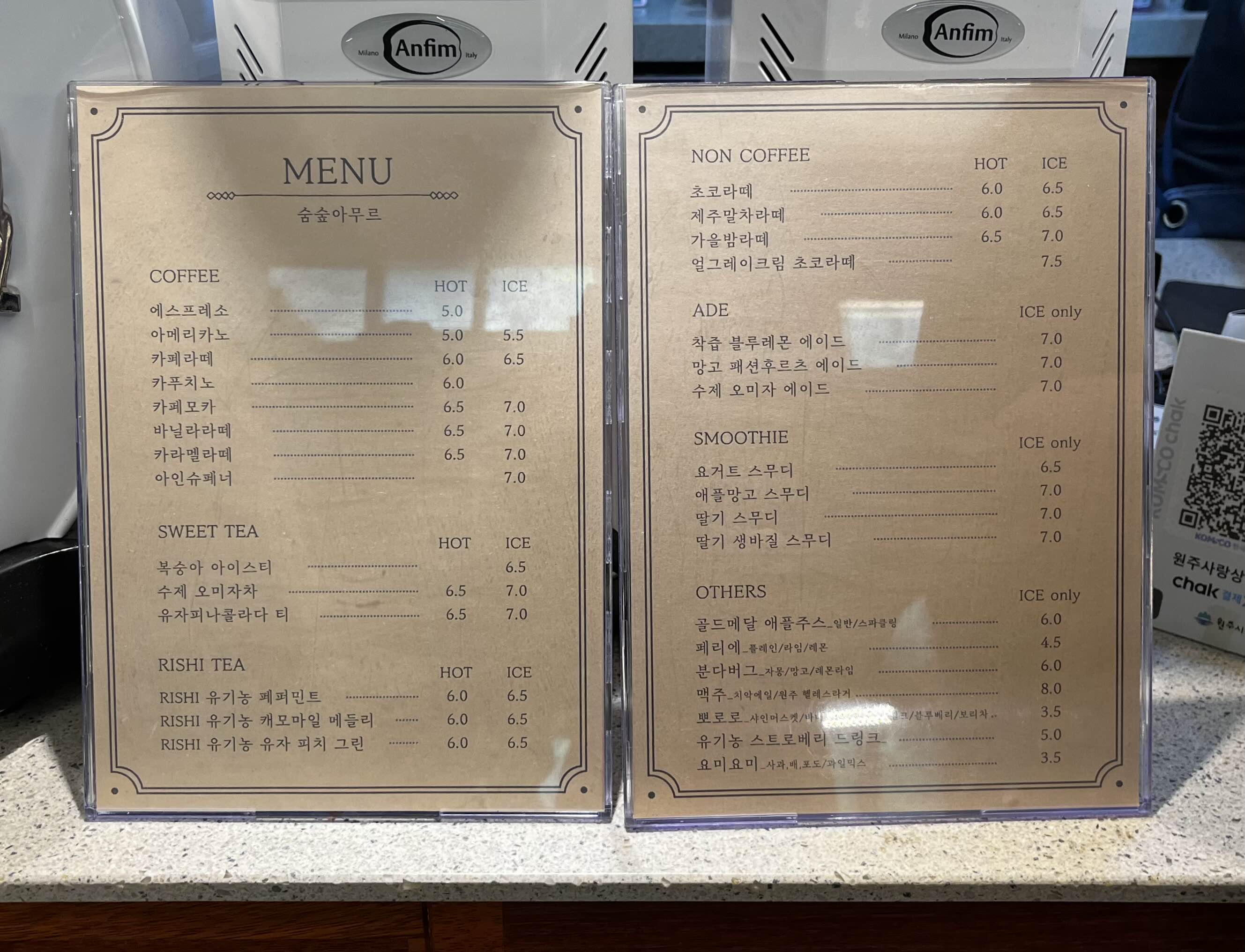 숨숲아무르에서 만나실 수 있는 전체 음료 메뉴입니다