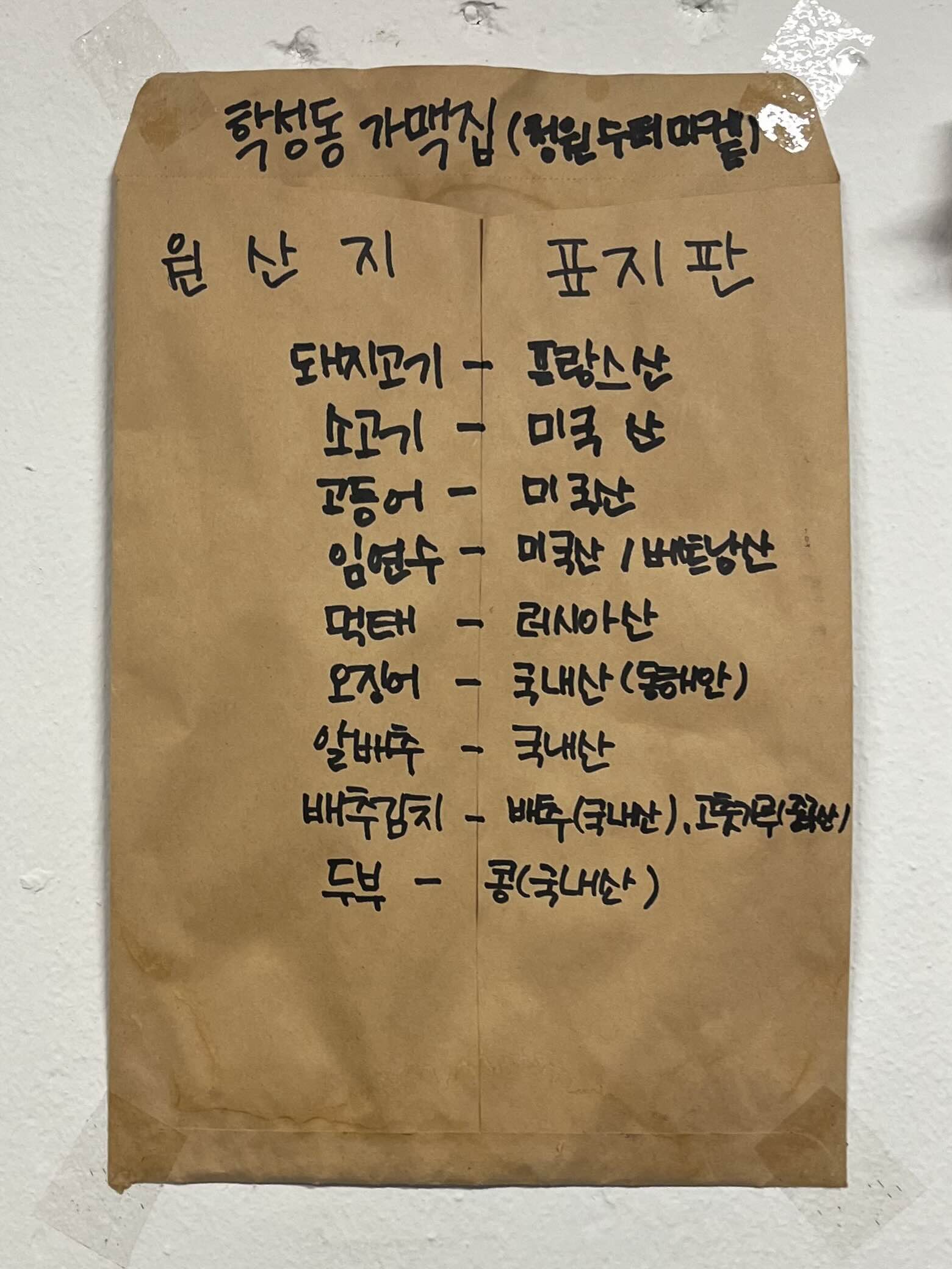 메뉴판과 원산지 표기마저 가맥집스러운 느낌입니다
