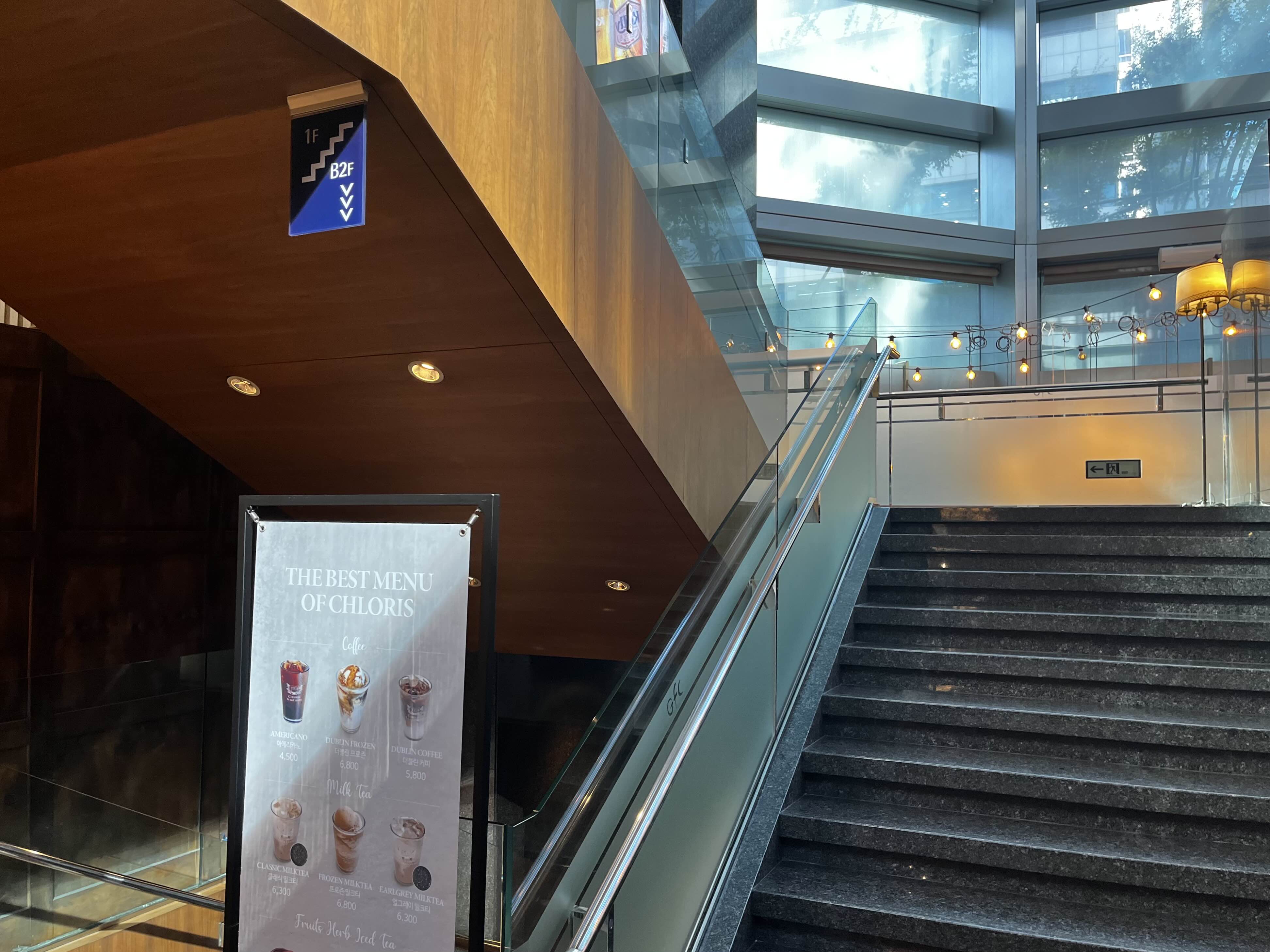 클로리스 카페 중간에 위치한 계단을 통해 GFC몰 1층으로 올라갈 수 있게 되어 있어요