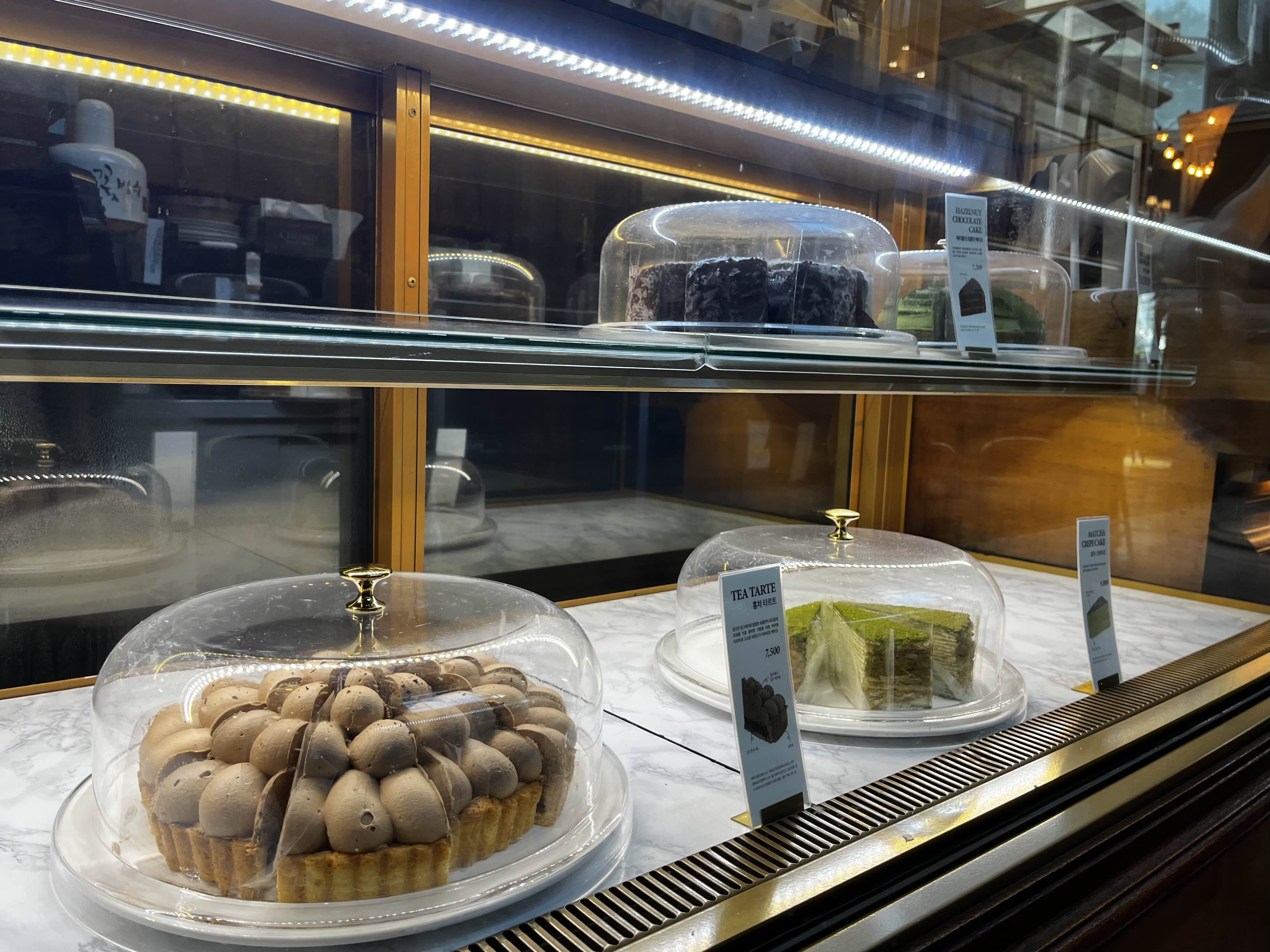 제가 갔던 날, 조각 케이크는 홍차 타르트 / 헤이즐넛 초콜릿 / 말차 크레이프 / 그린티 초콜릿 네 종류가 있었어요