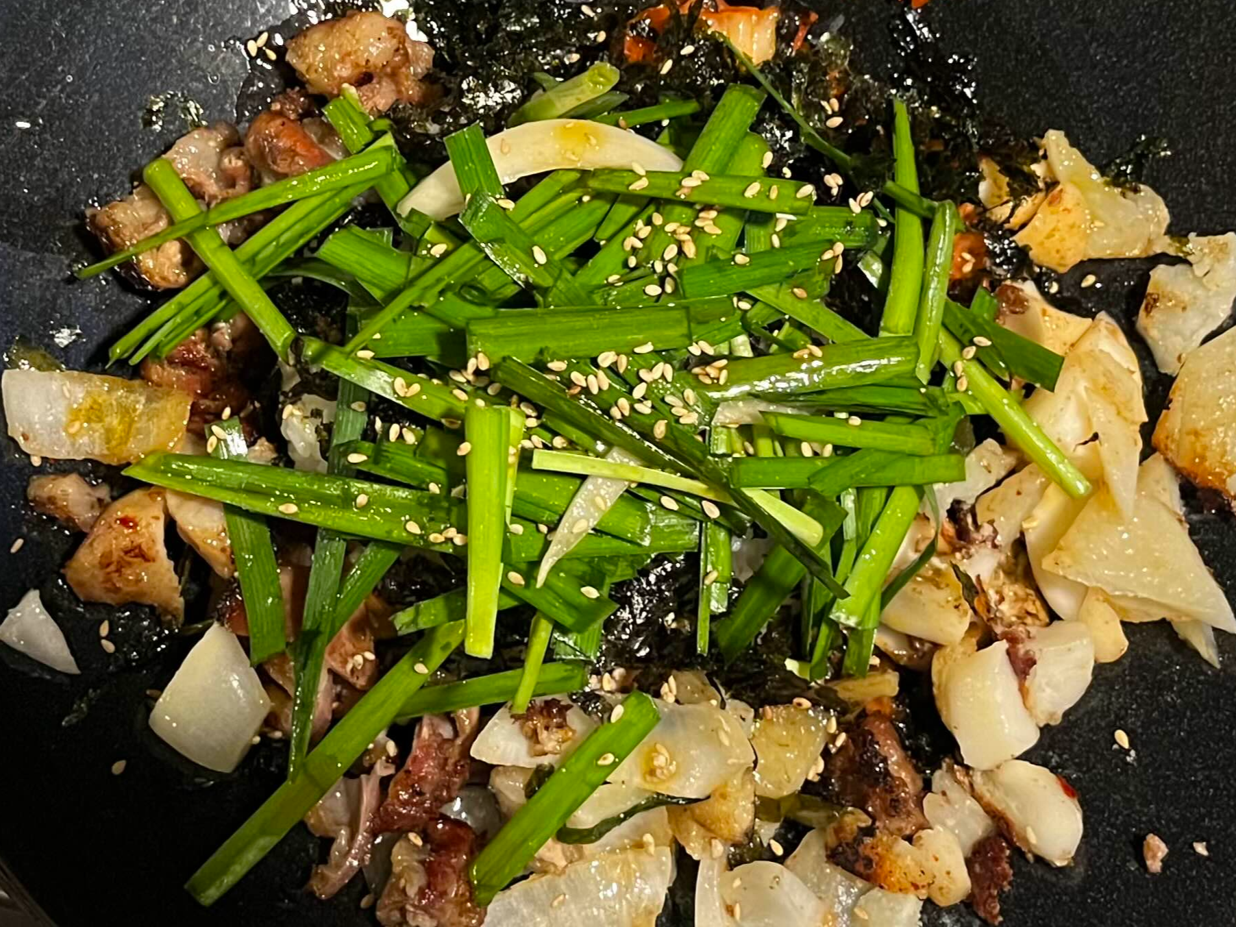 어느 정도 익으면 사장님께서 부추를 기름 빠지는 쪽으로 쇽쇽 올려주십니다