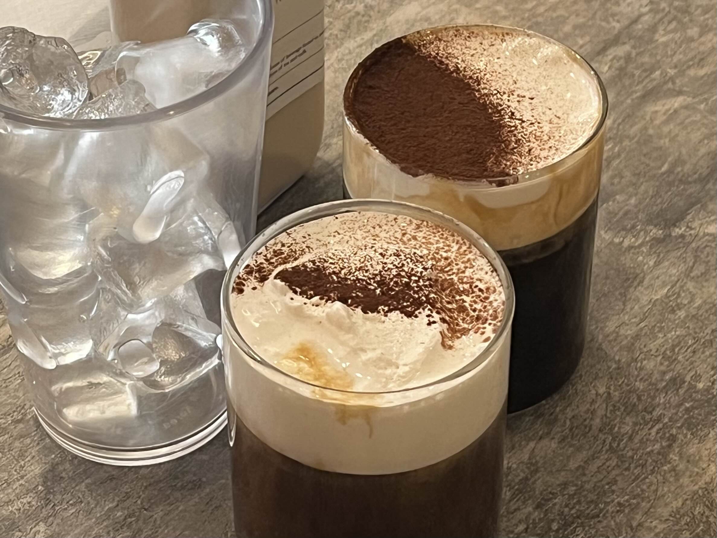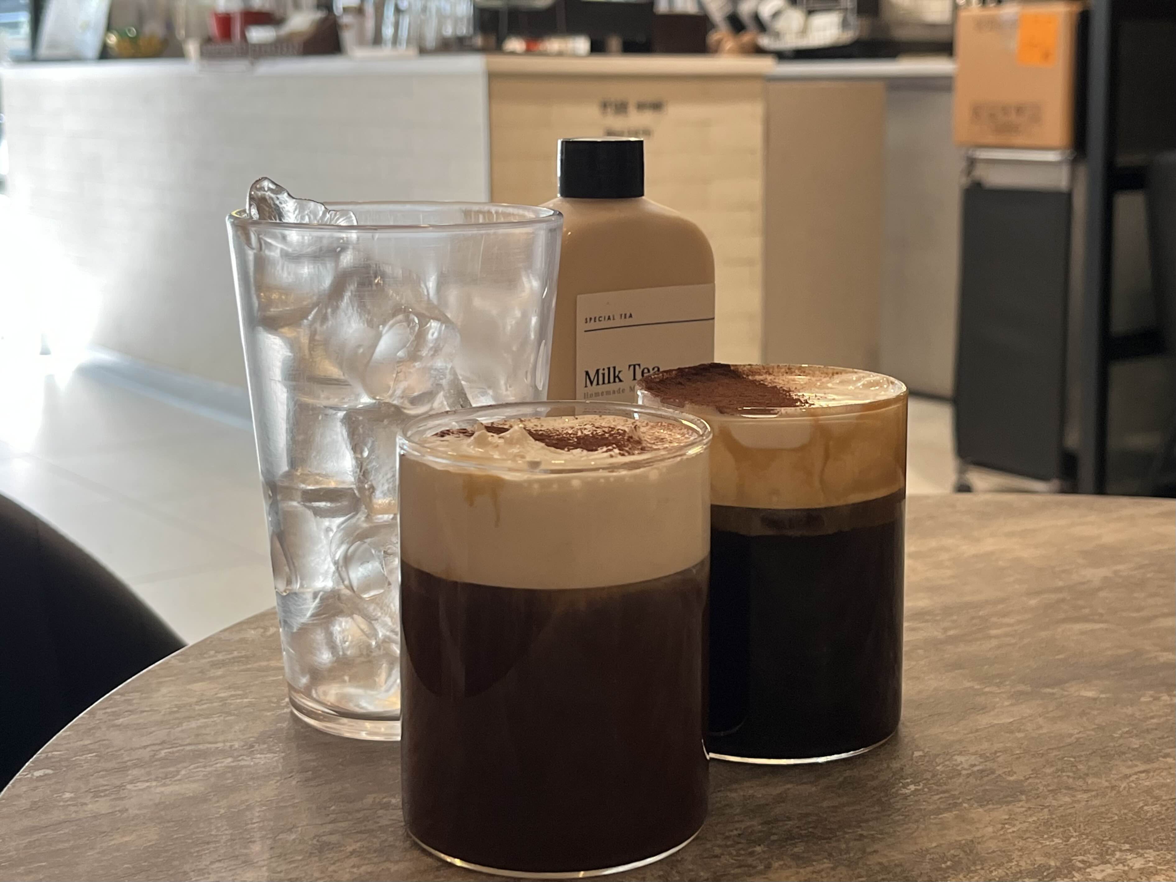 카페리의 베스트 커피메뉴 두 가지와 얼음컵이 따로 제공되는 냉침밀크티