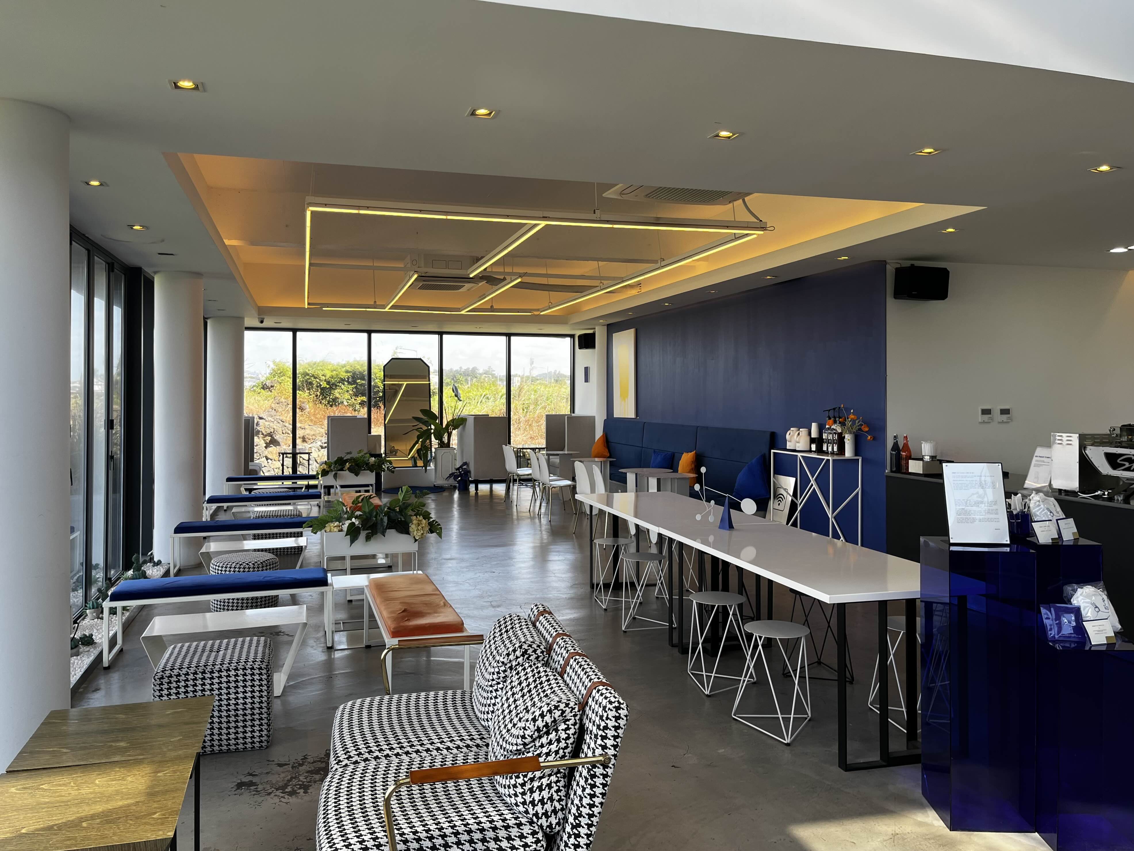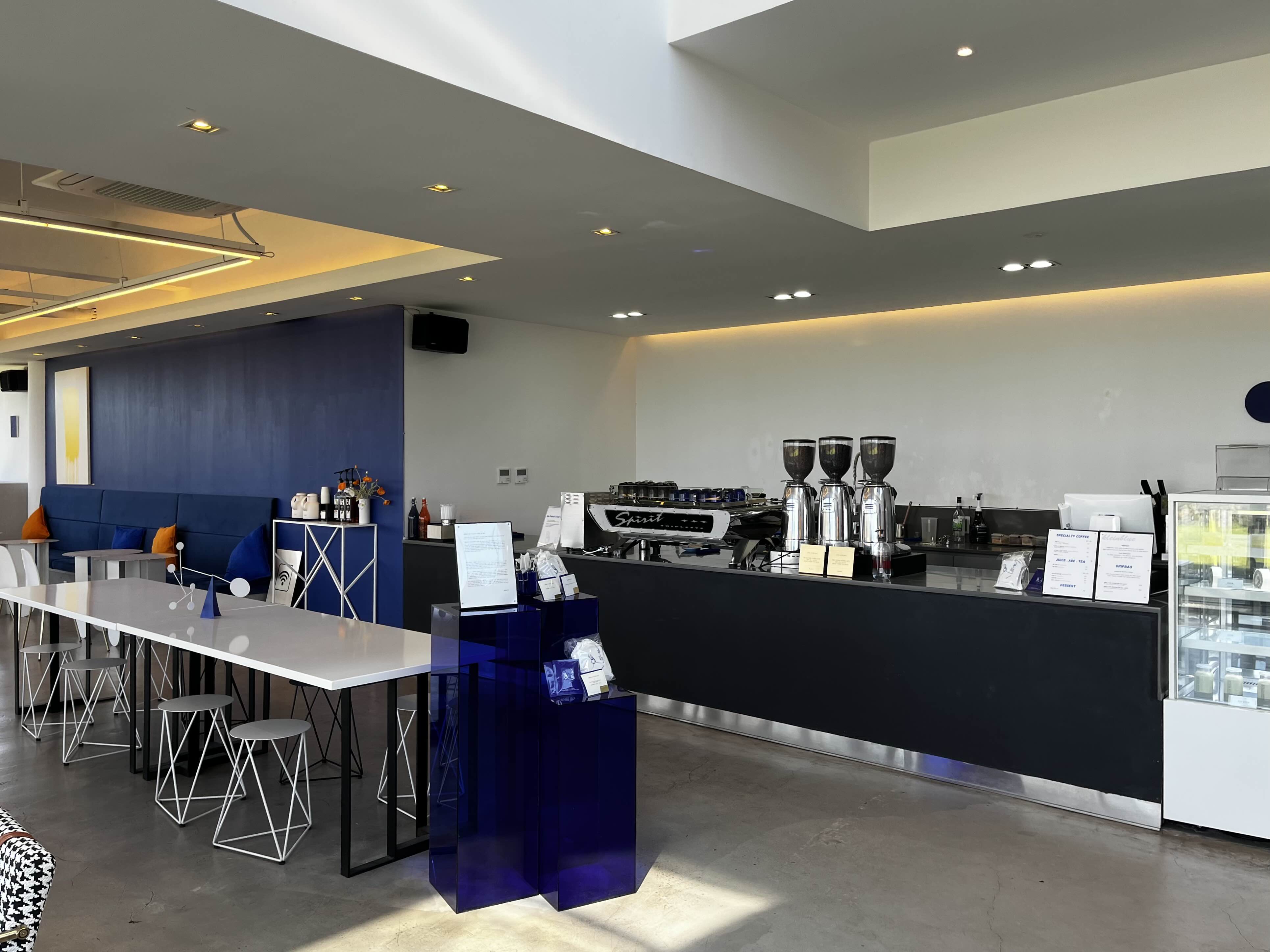 상호처럼 포인트컬러로 파란색이 들어간 인테리어의 클랭블루 1층 내부 모습