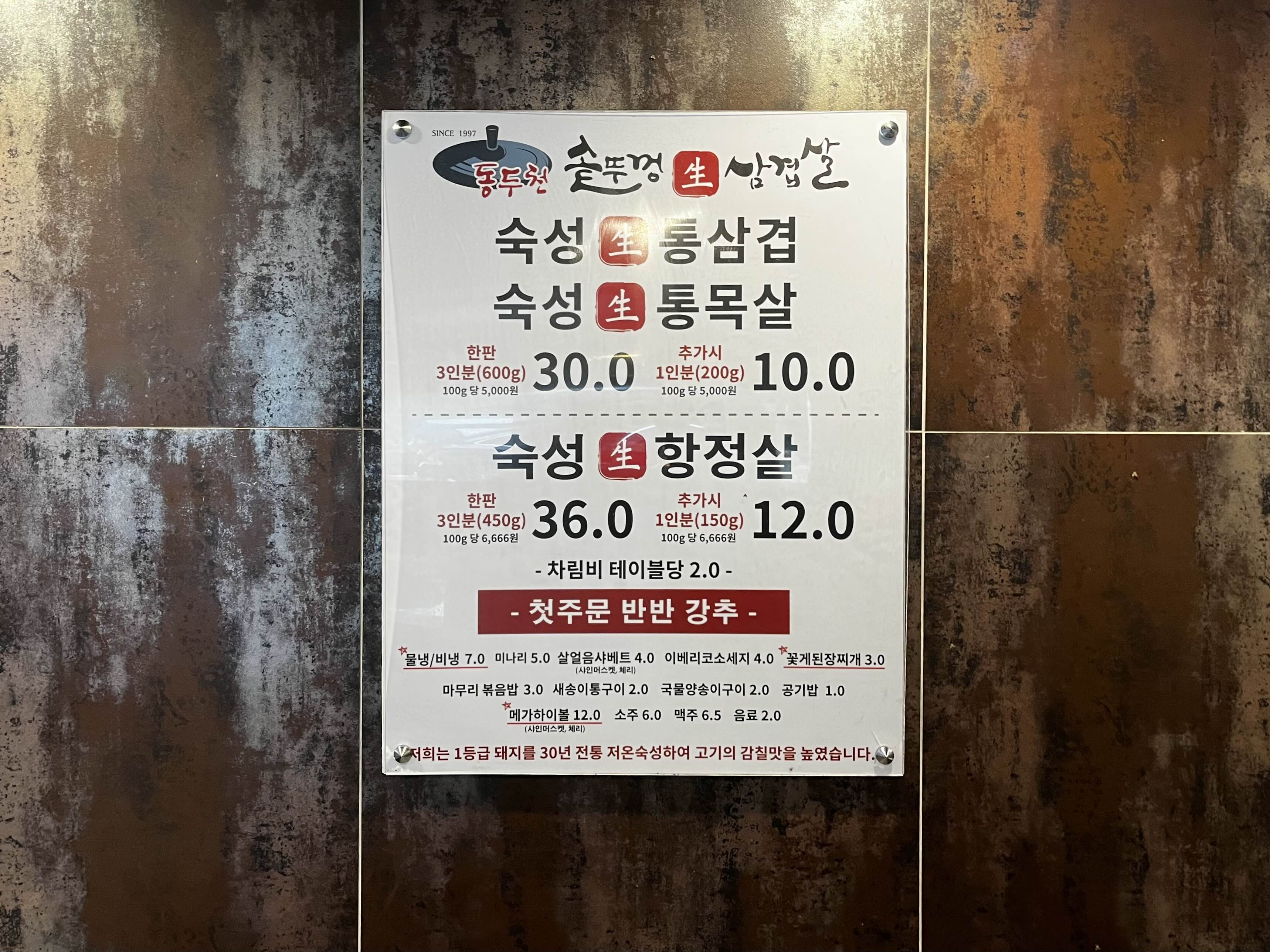 동두천솥뚜껑삼겹살의 메인메뉴는 통삼겹 / 통목살 / 항정살 세 가지