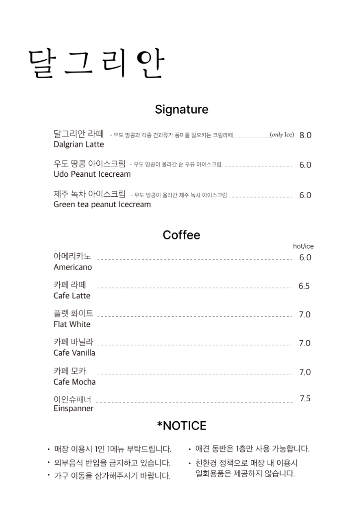 달그리안의 시그니처 메뉴로는 달그리안 라떼 / 우도 땅콩 아이스크림 / 제주 녹차 아이스크림