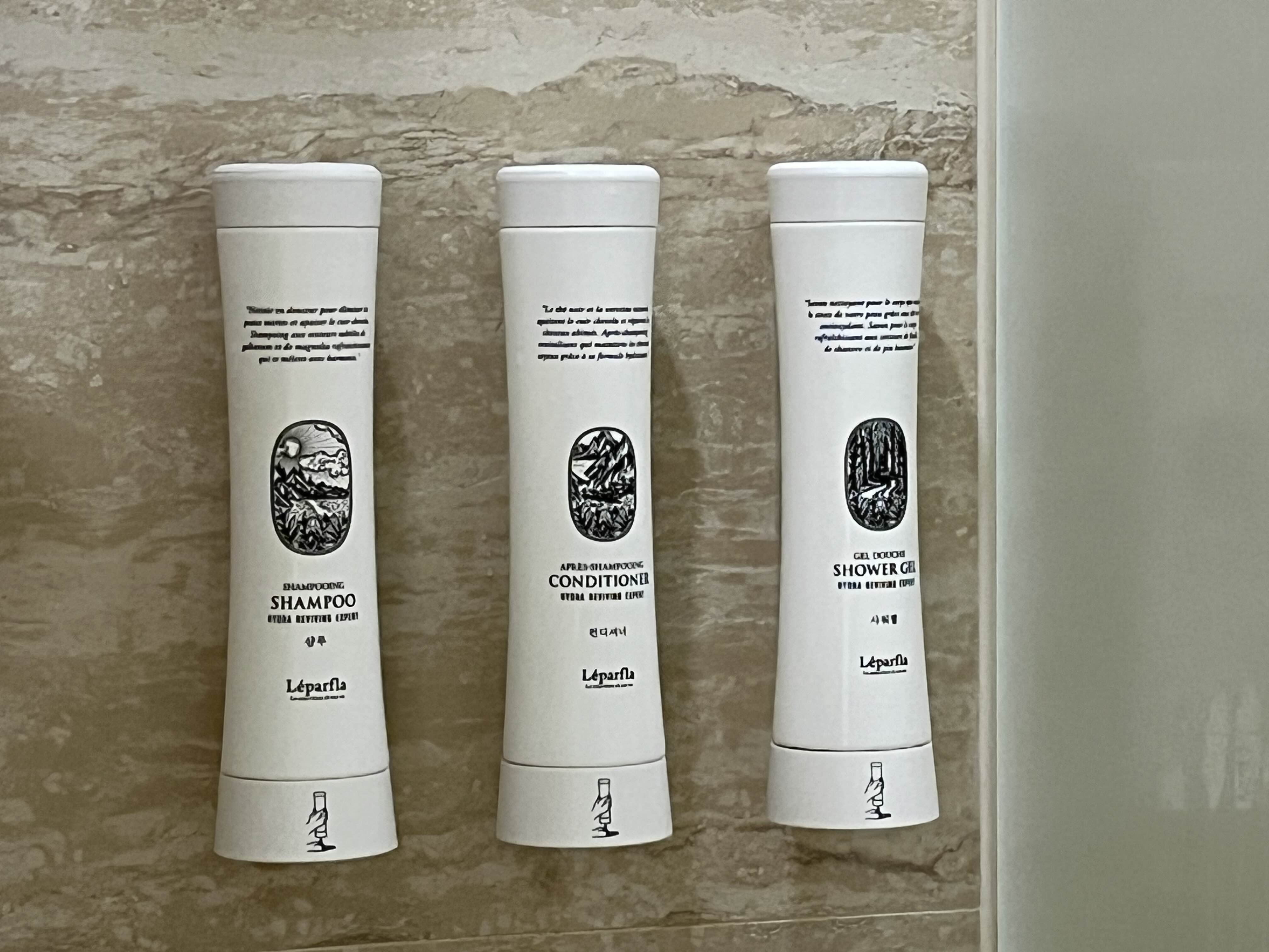 랜딩관 객실의 샴푸와 컨디셔너, 샤워젤 모두 한국 브랜드인 Leparfla(르빠플라)