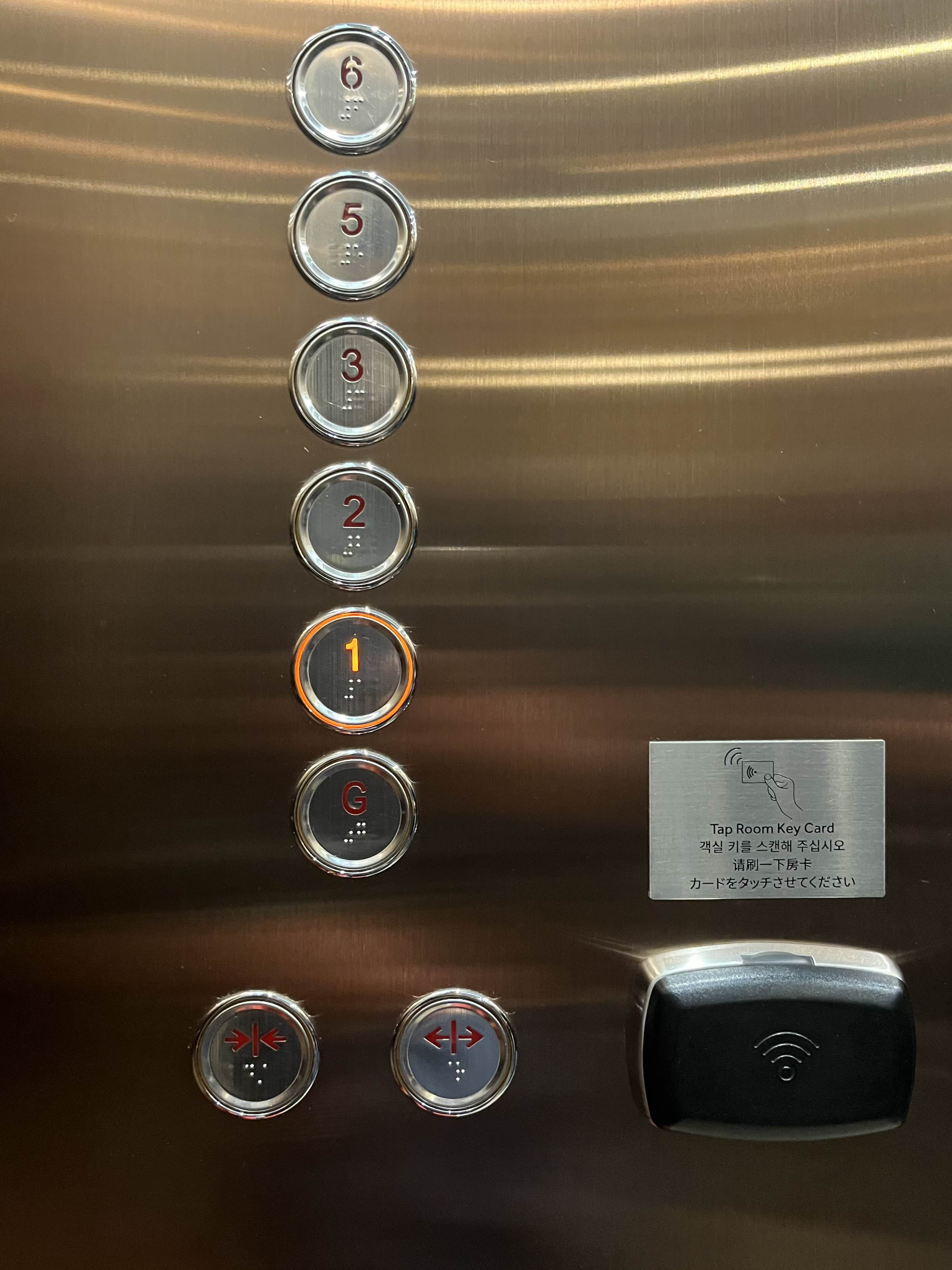 객실로 이동하기 위해서는 먼저, 체크인했던 랜딩관 로비 / G층에서 첫 번째 엘리베이터를 타고 1층으로 이동합니다