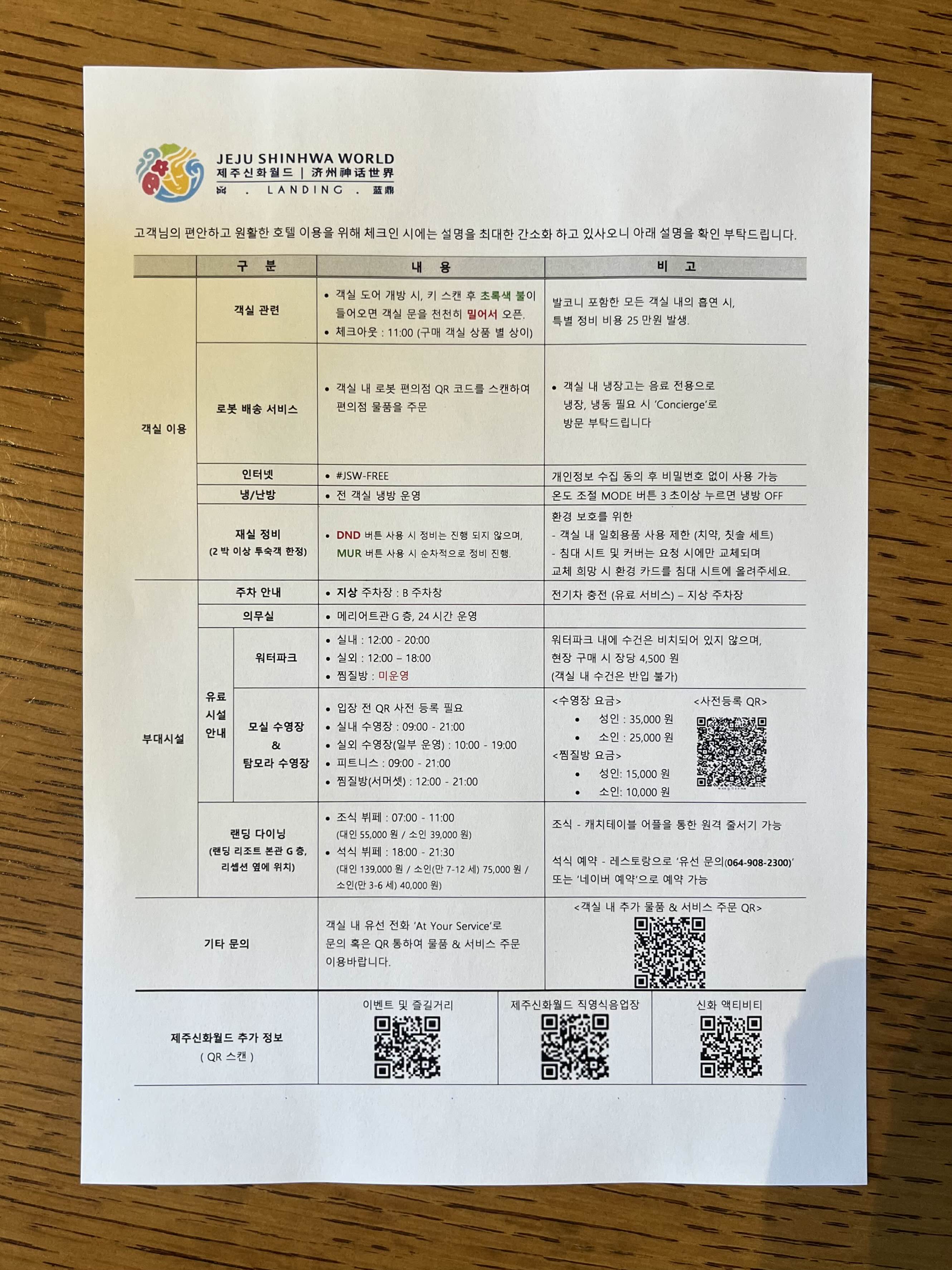 체크인을 마친 후 받은 리조트 지도와 객실 및 부대시설 관련 안내사항,