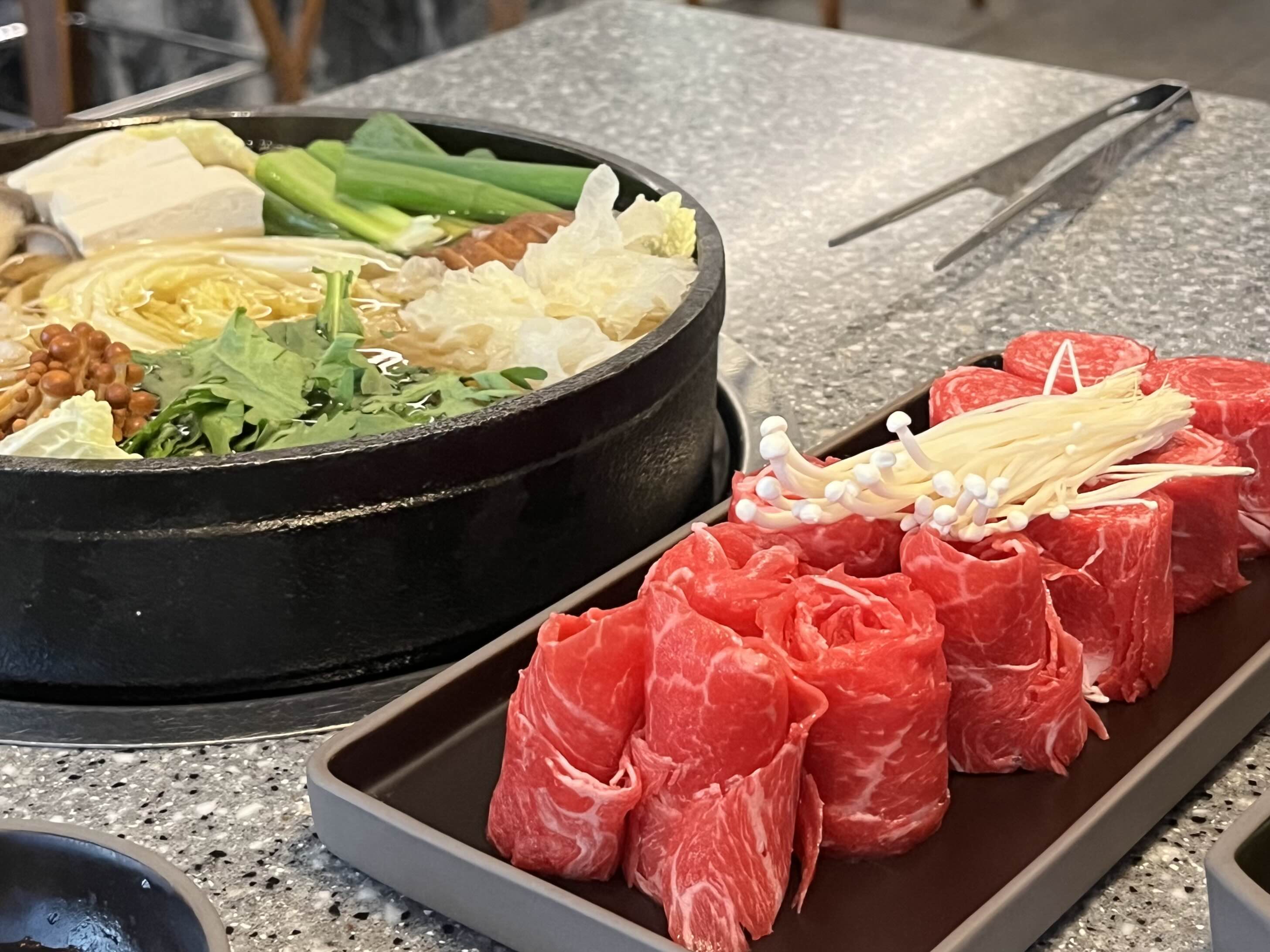 고기는 얇은 두께로 예쁘게 돌돌 말려 있는데, 전골에 넣을 때 집게를 이용해 살살 한 겹으로 잘 풀어주세요