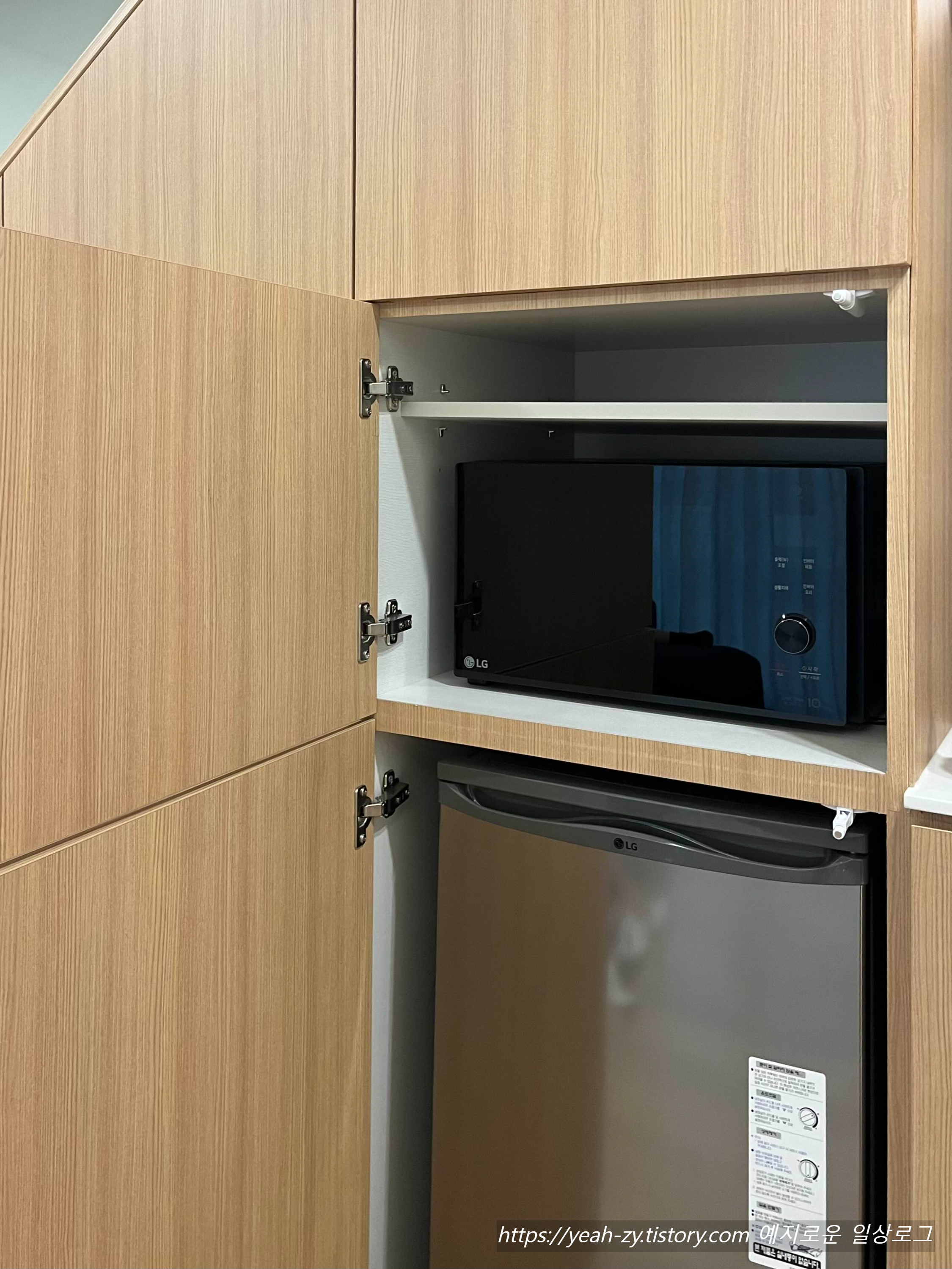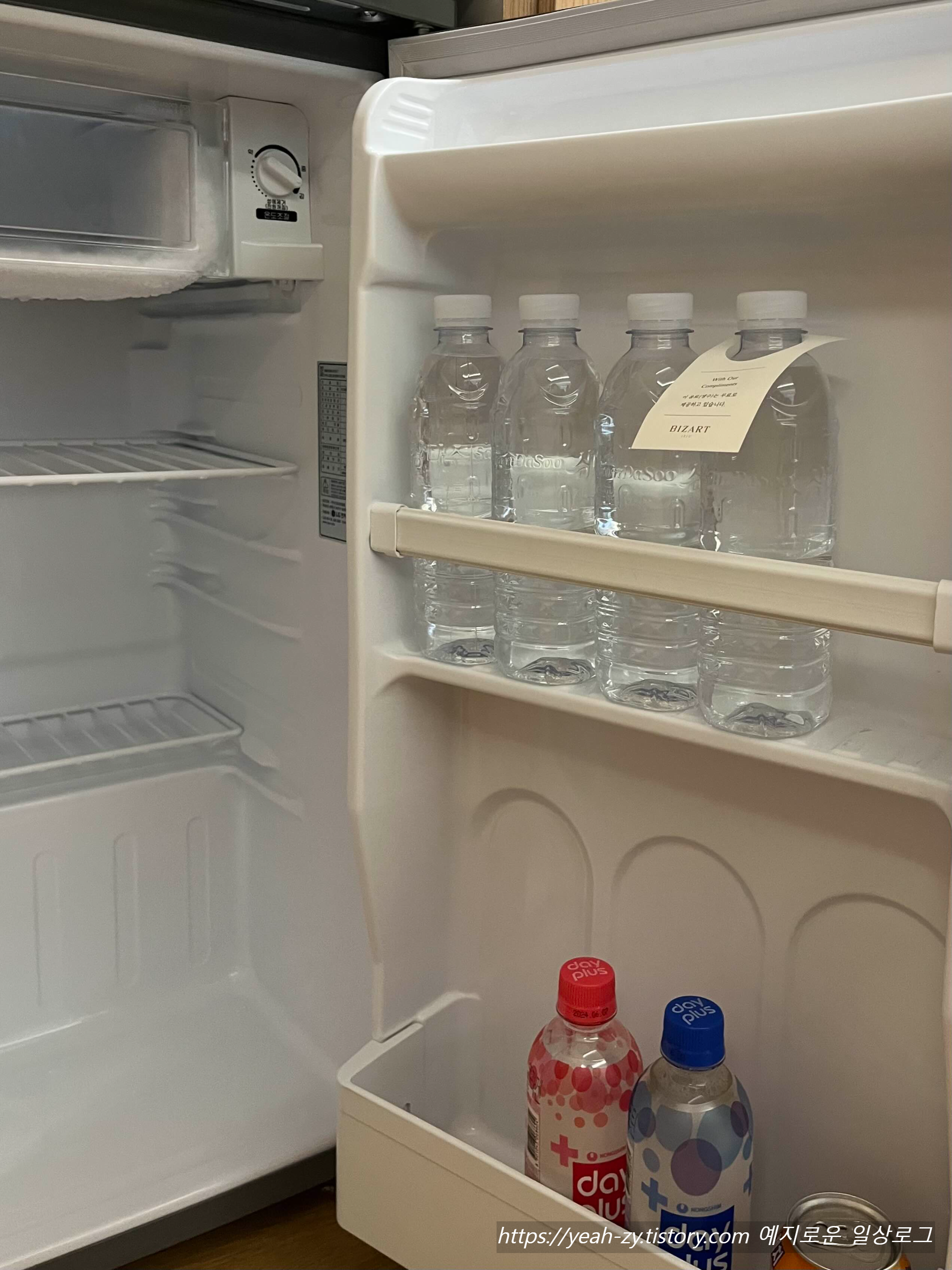 냉장고 안에는 기본으로 제공되는 생수 4개와 이온음료 2개, 캔음료 1개가 있었어요