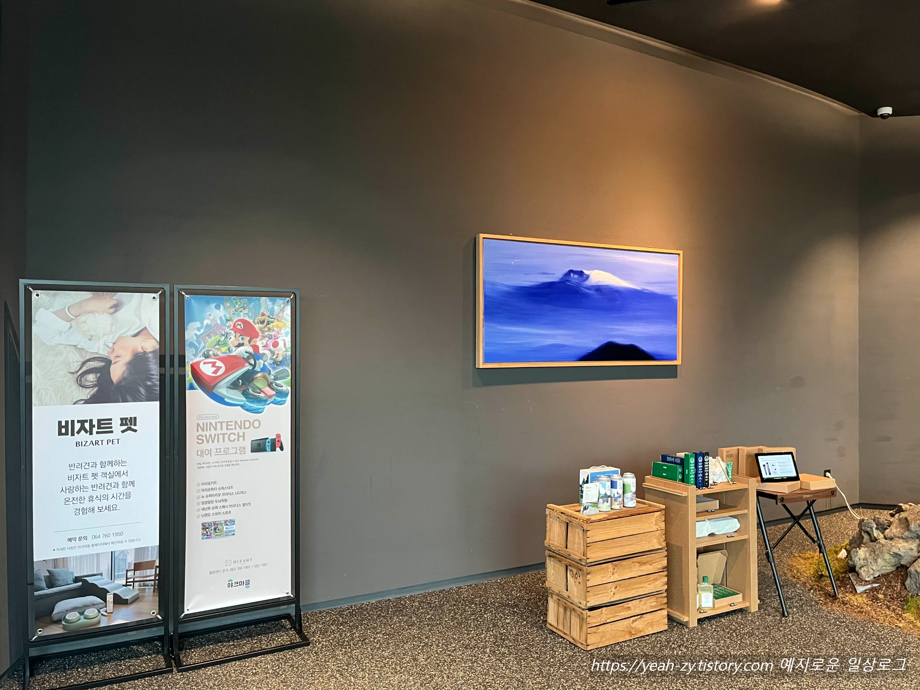 내부는 리셉션 데스크, 야크마을 안내 및 굿즈상품 전시공간, 테이블로 이루어진 심플한 공간