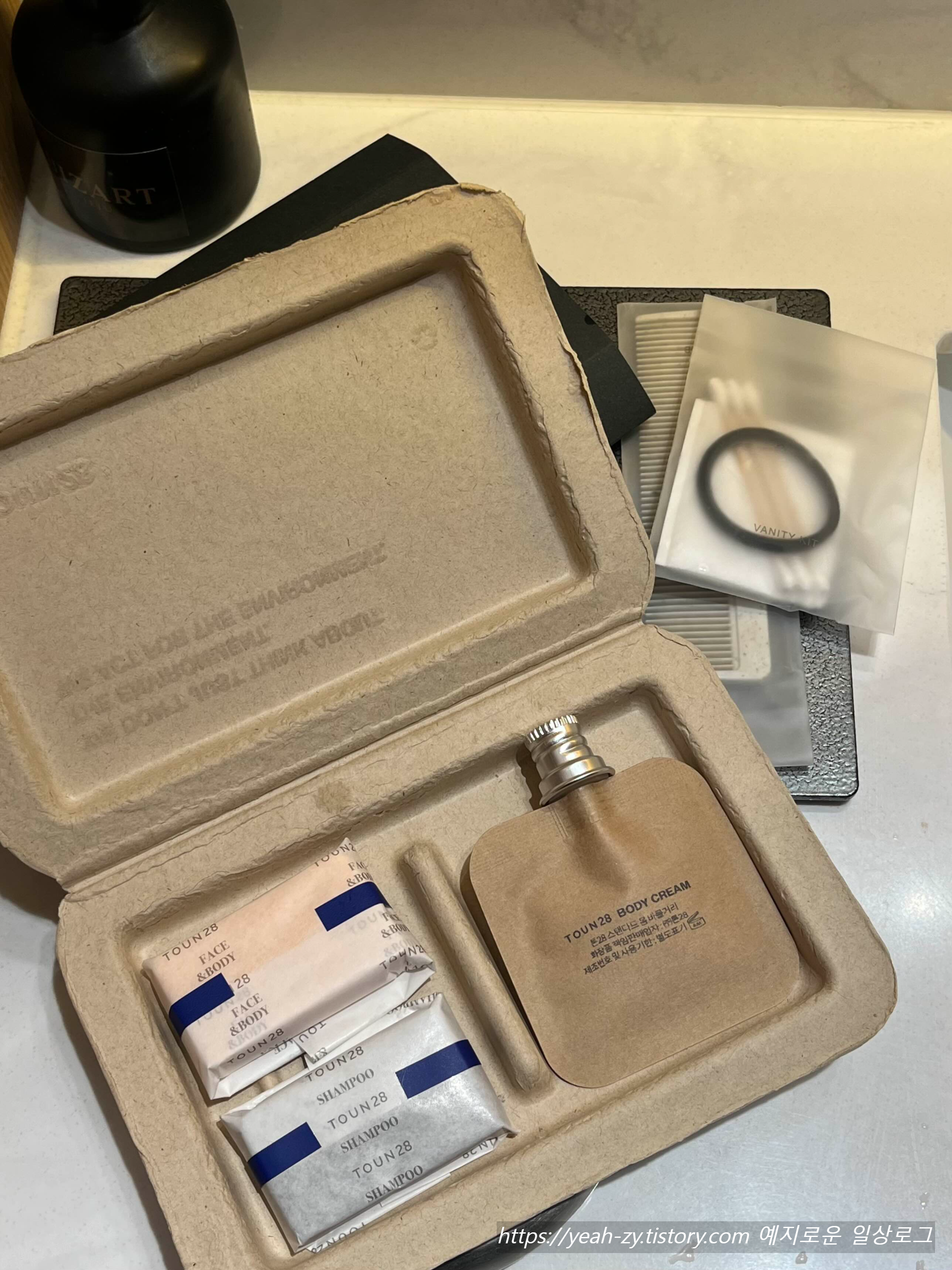어메니티 모두 가벼운 구성, 종이패키지로 만들어져 환경을 생각하는 기업모토가 느껴진 점은 좋았어요