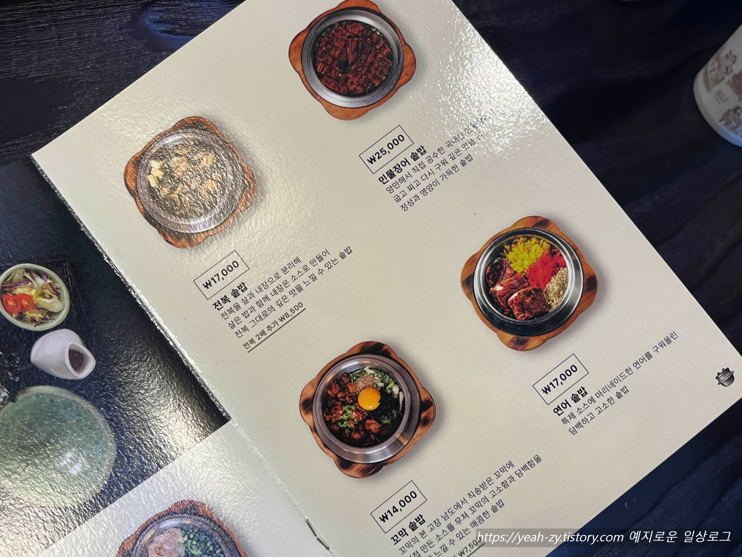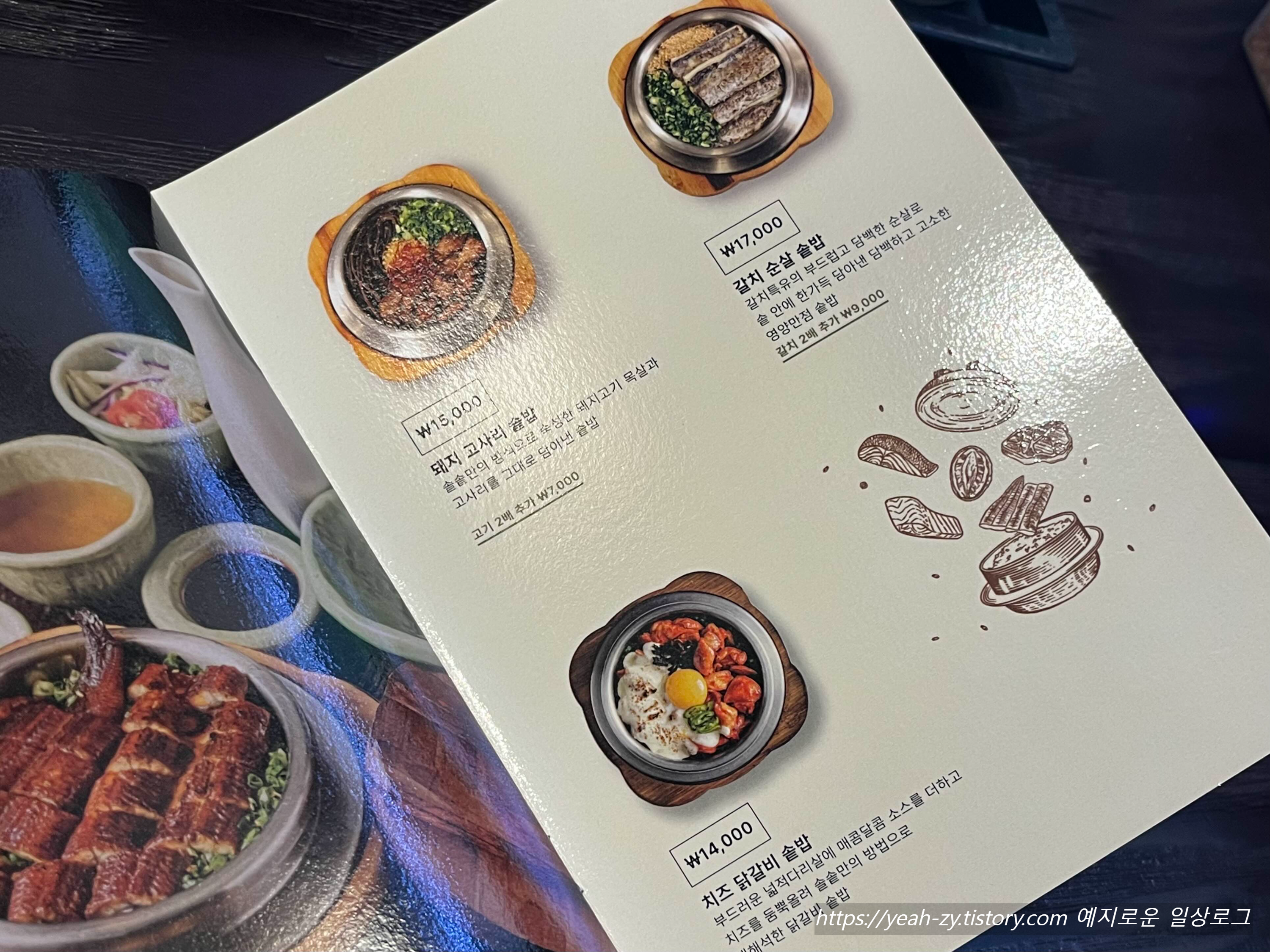 메인메뉴 솥밥은 돼지 고사리 / 갈치 순살 / 치즈 닭갈비 / 전복 / 민물장어 / 도미관자 등등