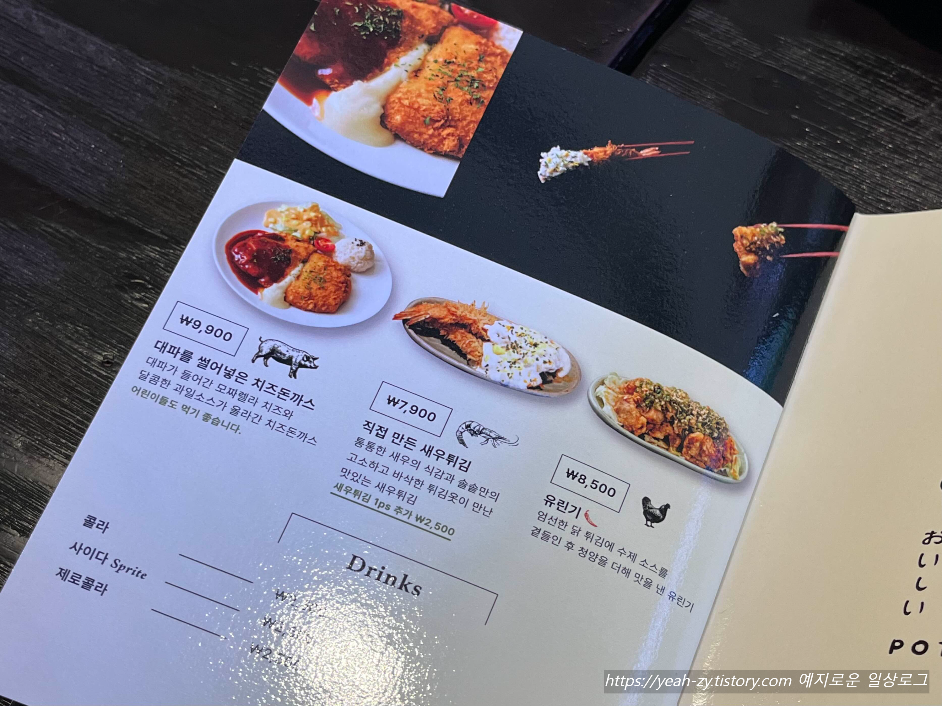메인인 솥밥 종류 외 메뉴는 치즈돈가스 / 새우튀김 / 유린기