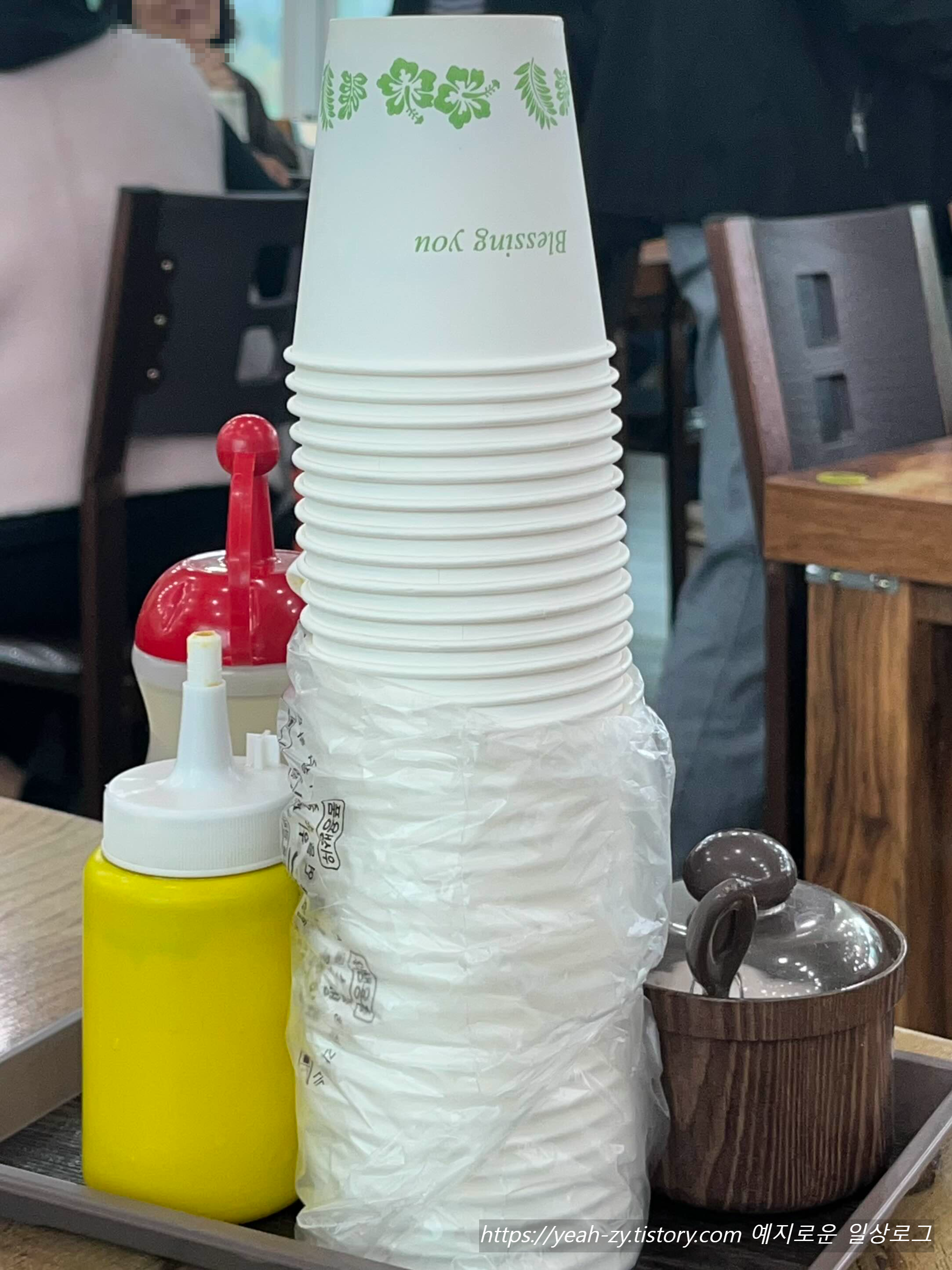 종이컵과 겨자, 식초, 설탕은 각 테이블마다 깔끔하게 세팅되어 있어요