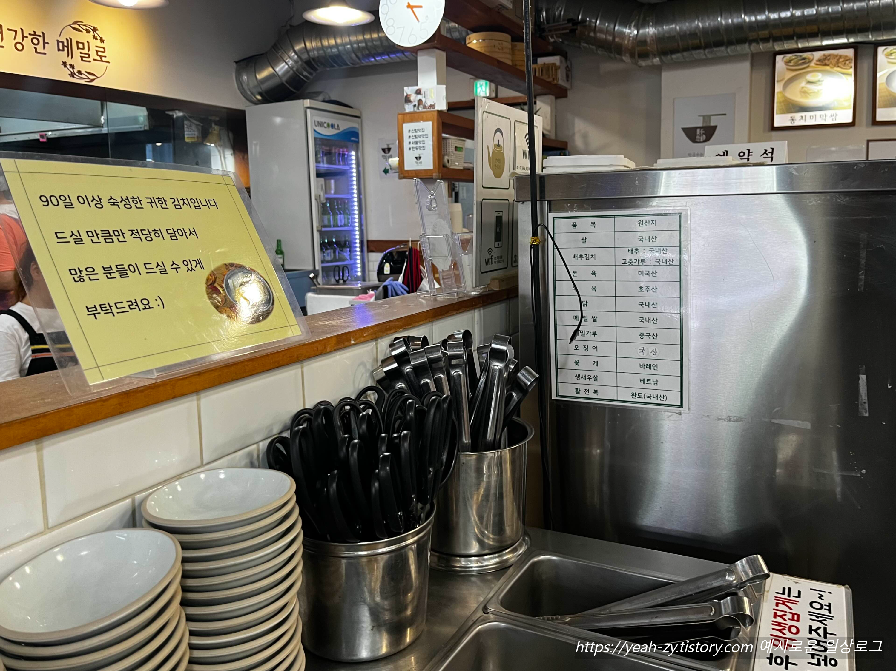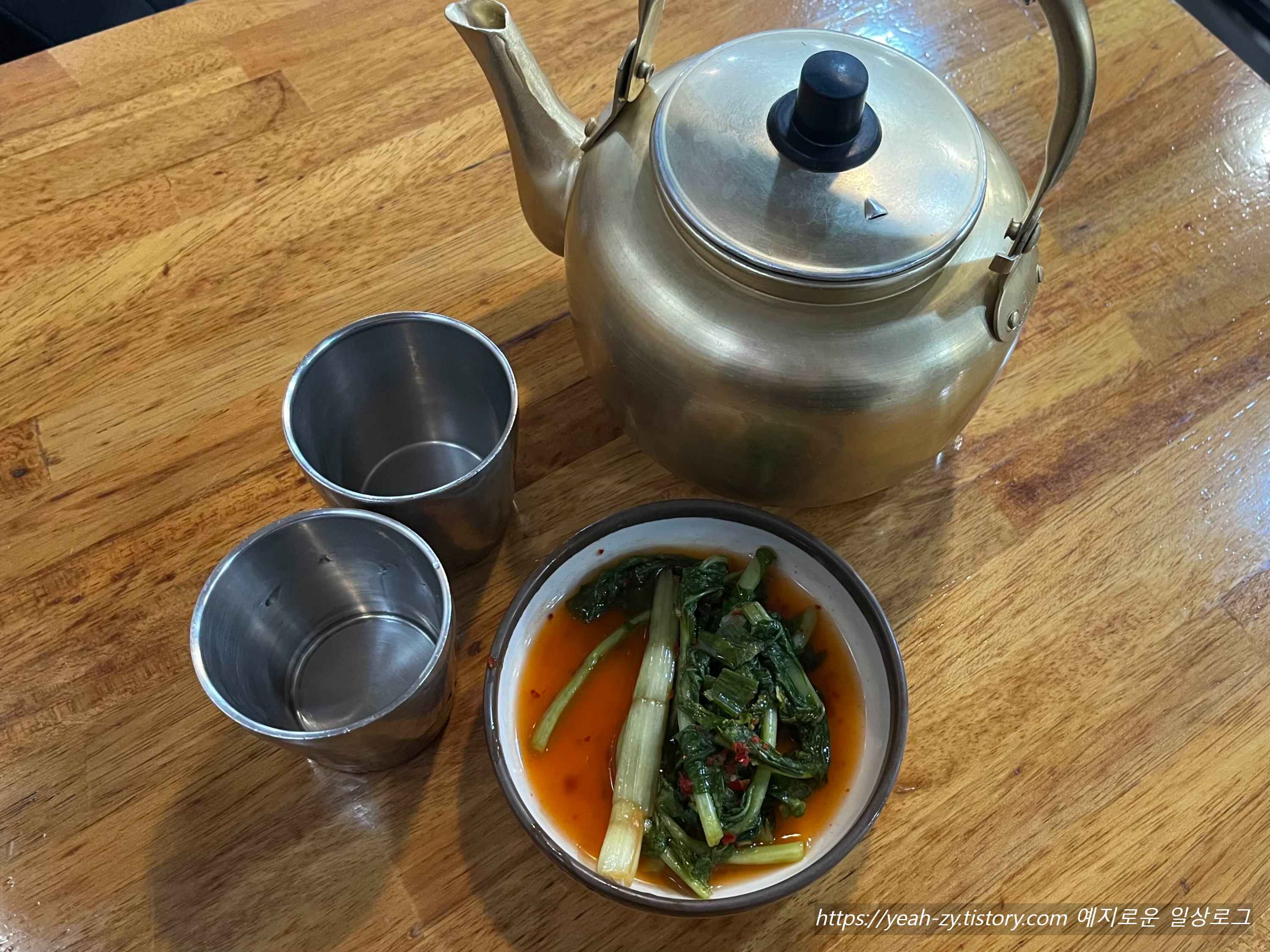 겨자 / 식초 / 간장 등 조미료는 각 테이블에, 기본세팅은 따끈한 온육수와 시원한 열무김치