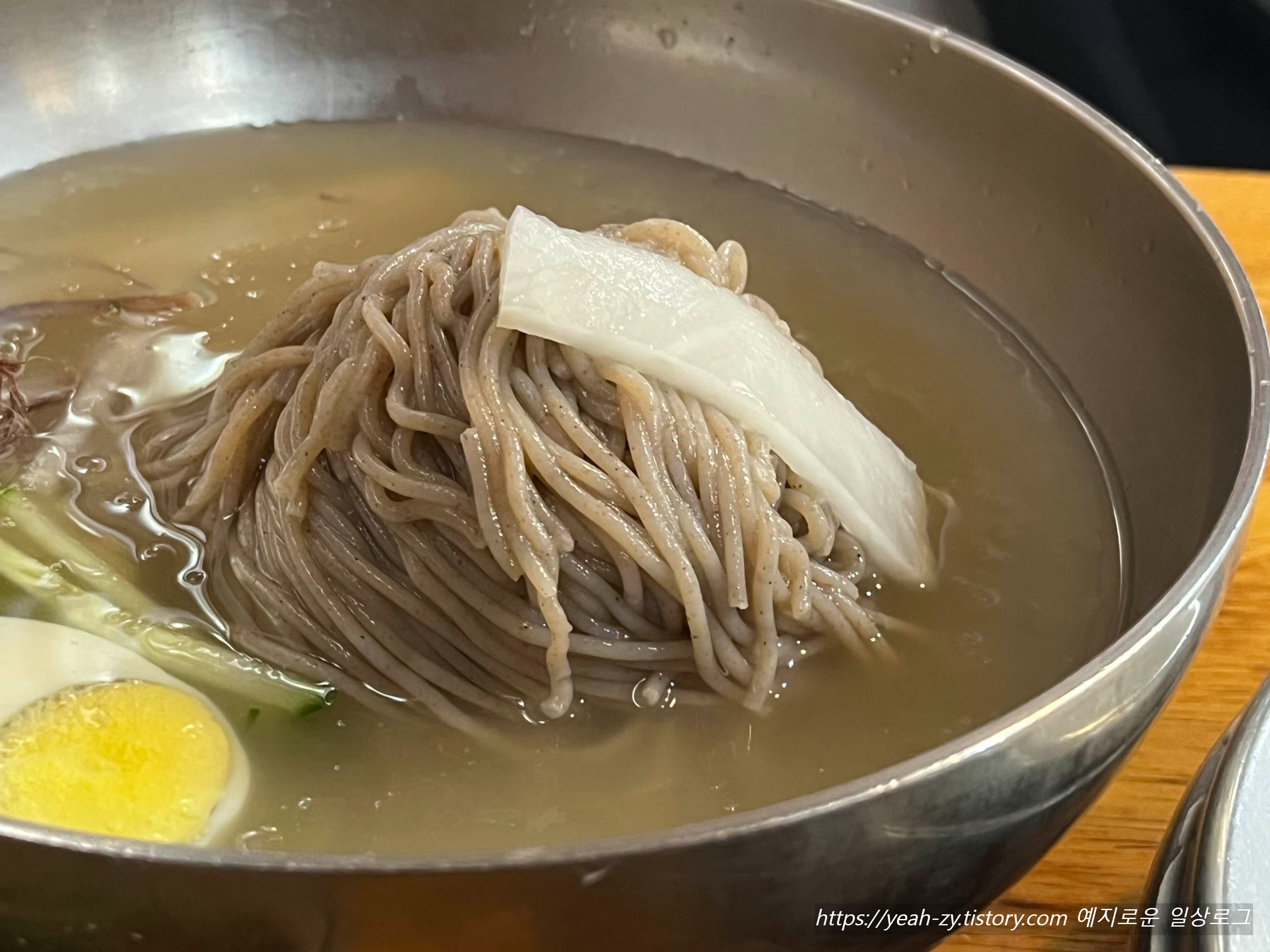 예상했던 새콤하고 시원한 동치미 국물이 아니라 약간 평양냉면 스타일의 단조로운 맛