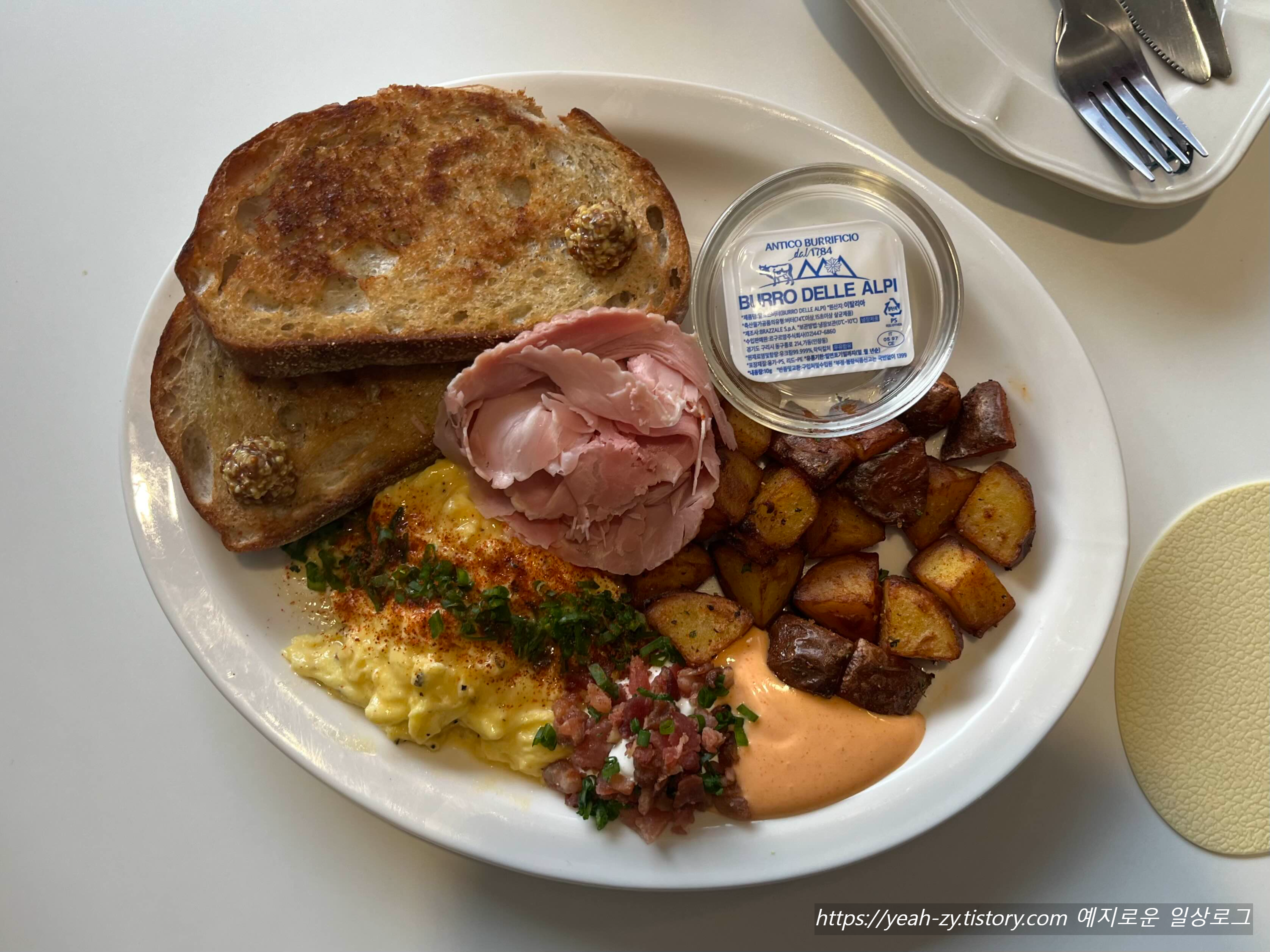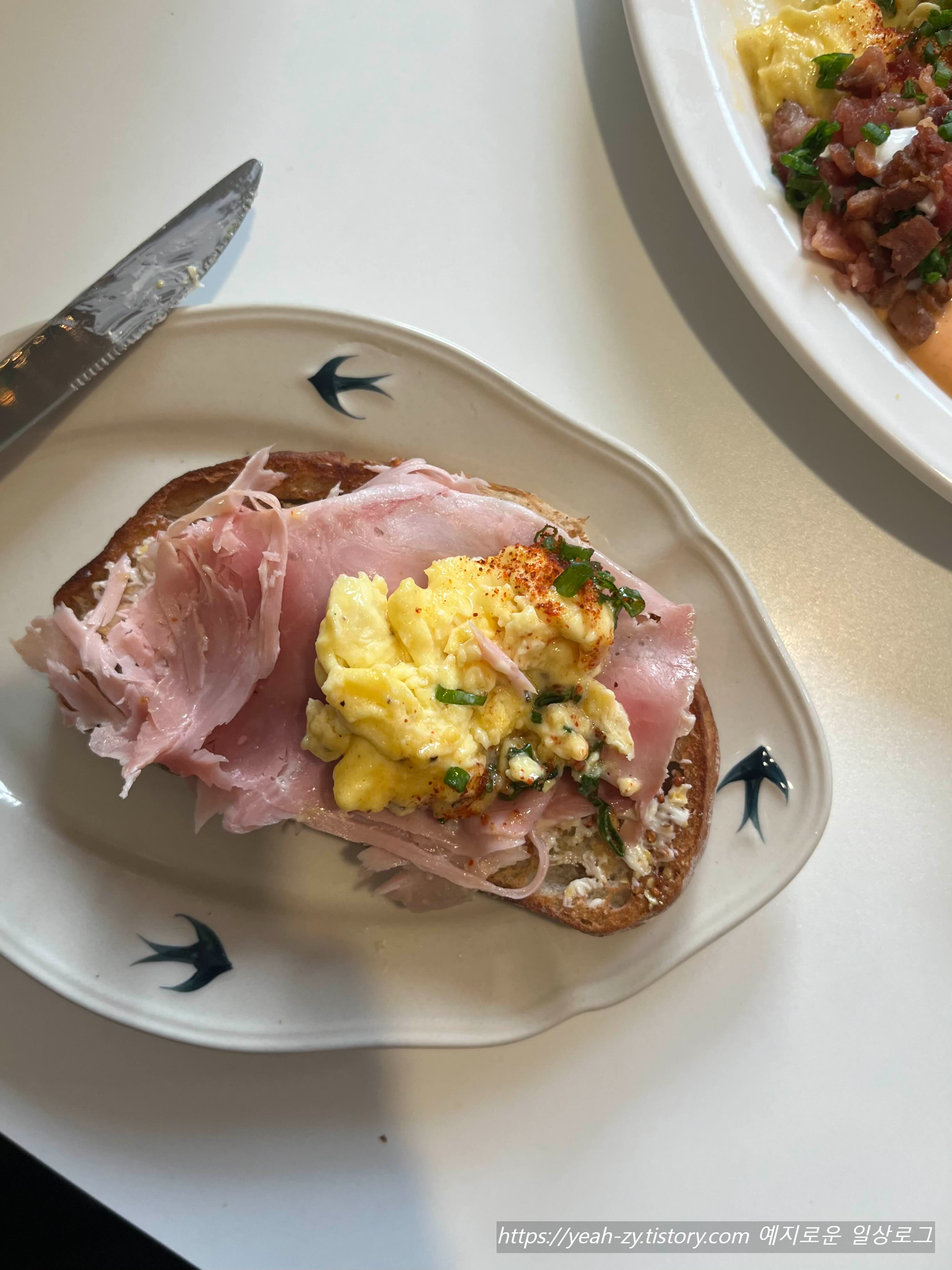 저는 호밀빵, 잠봉 햄, 스크램블, 브런치 감자, 베이컨 사워크림, 스파이시 마요소스 구성의 플래터를 선택!