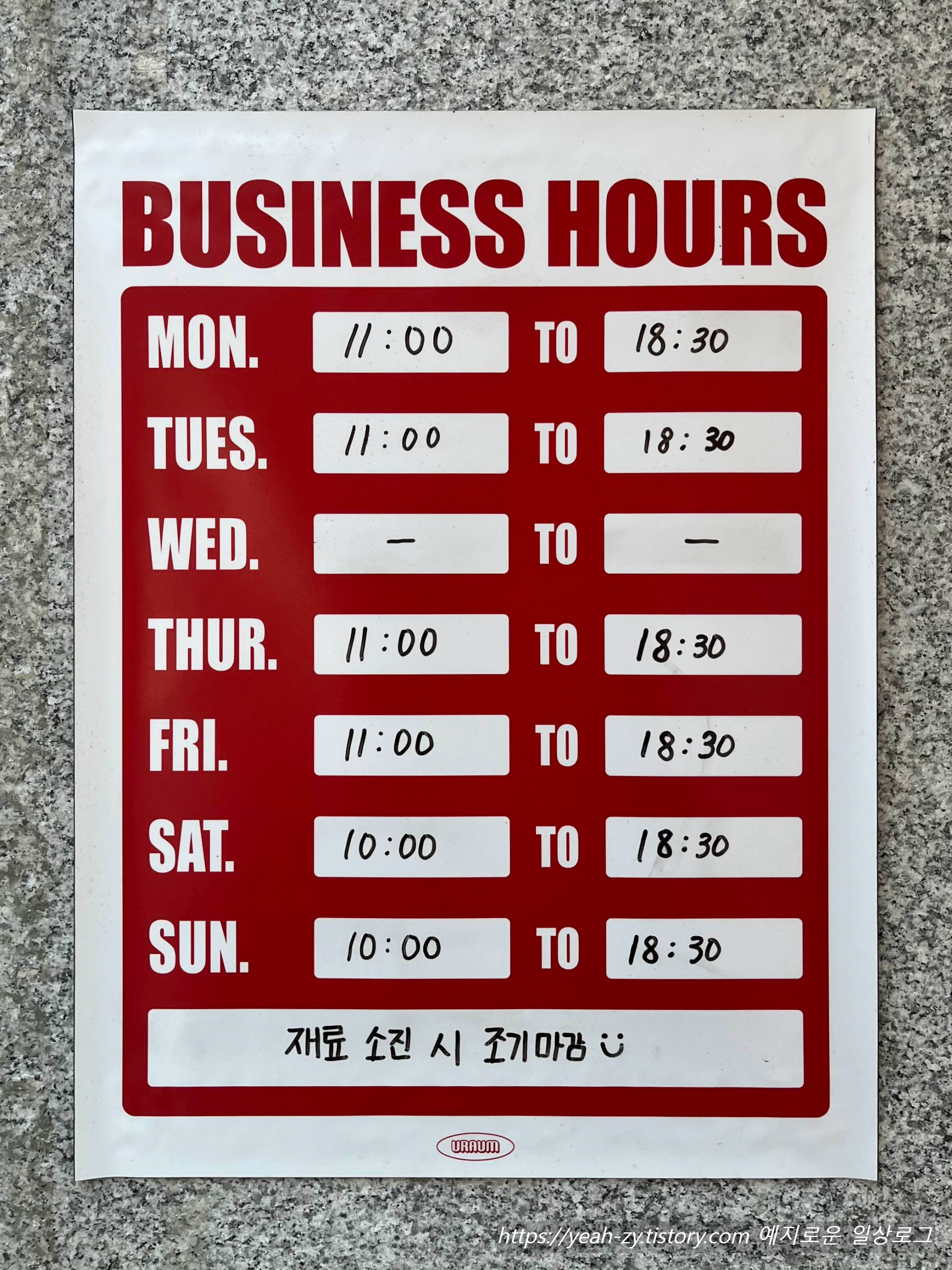 - 영업시간 : 평일 11:00 ~ 18:30 주말 10:00 ~ 18:30 매주 수요일 정기휴무