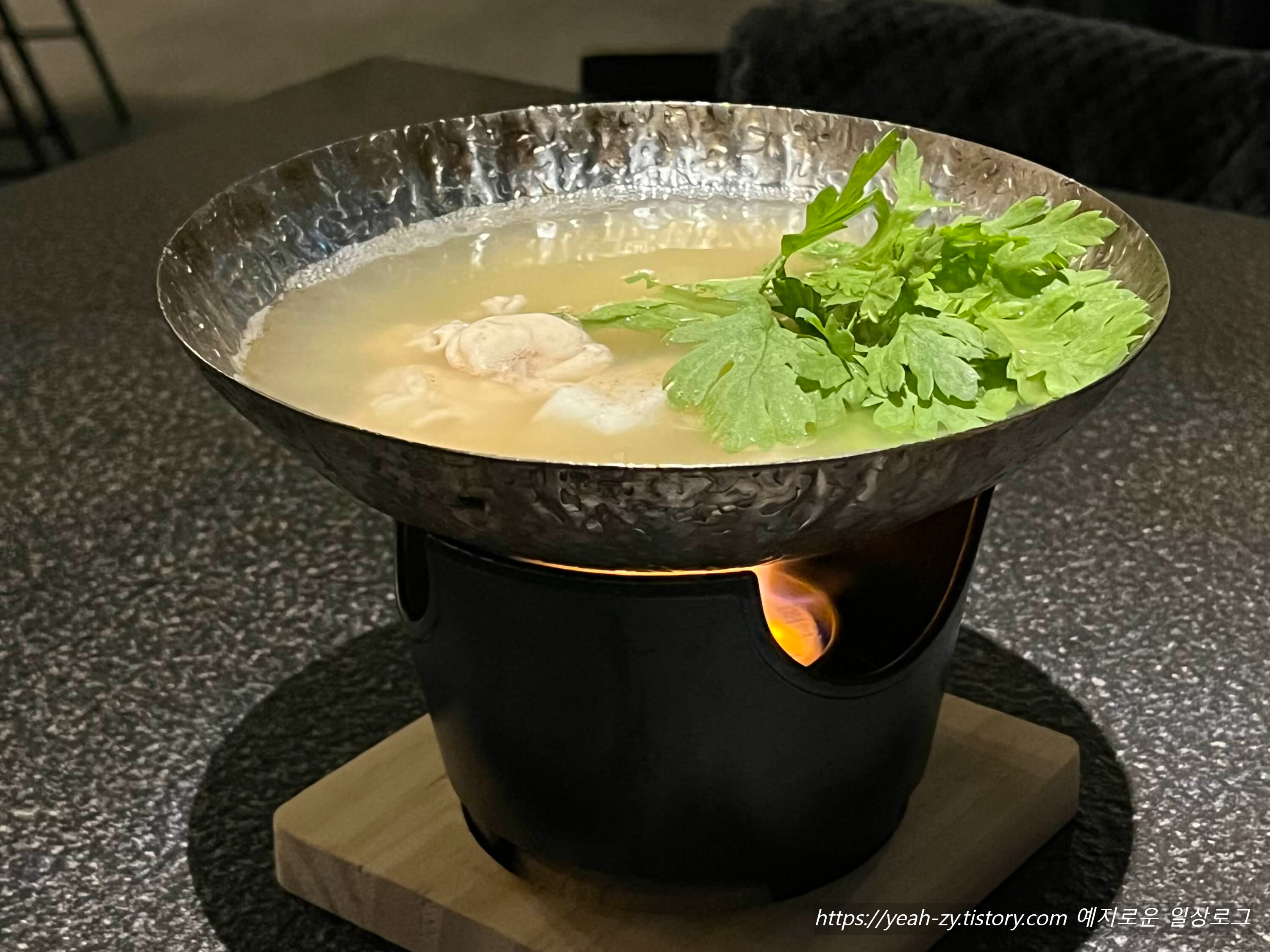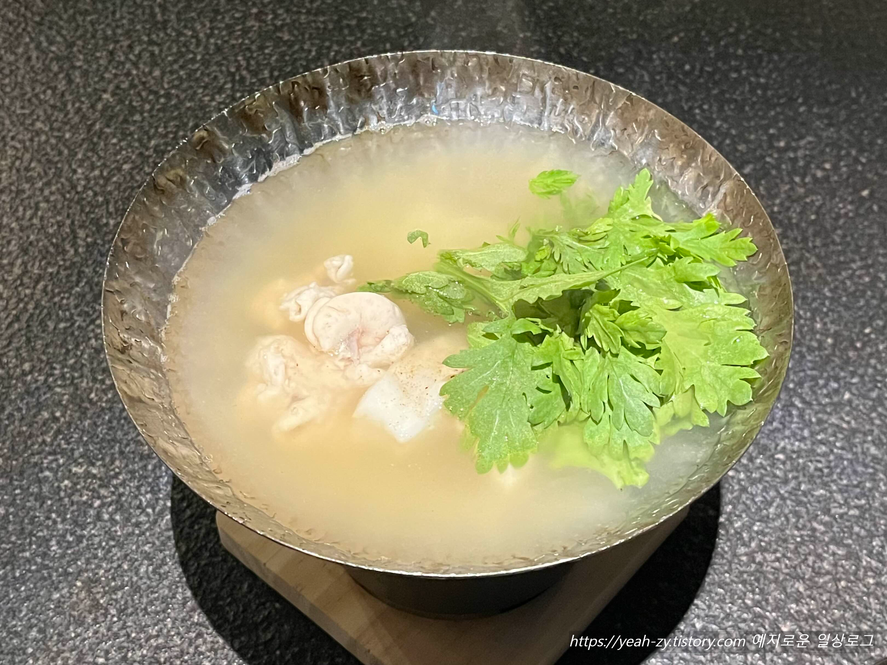 생선살, 고니, 쑥갓, 무 등 여러 재료와 생선 육수가 들어가고, 충분히 끓인 후 드시면 돼요♨️