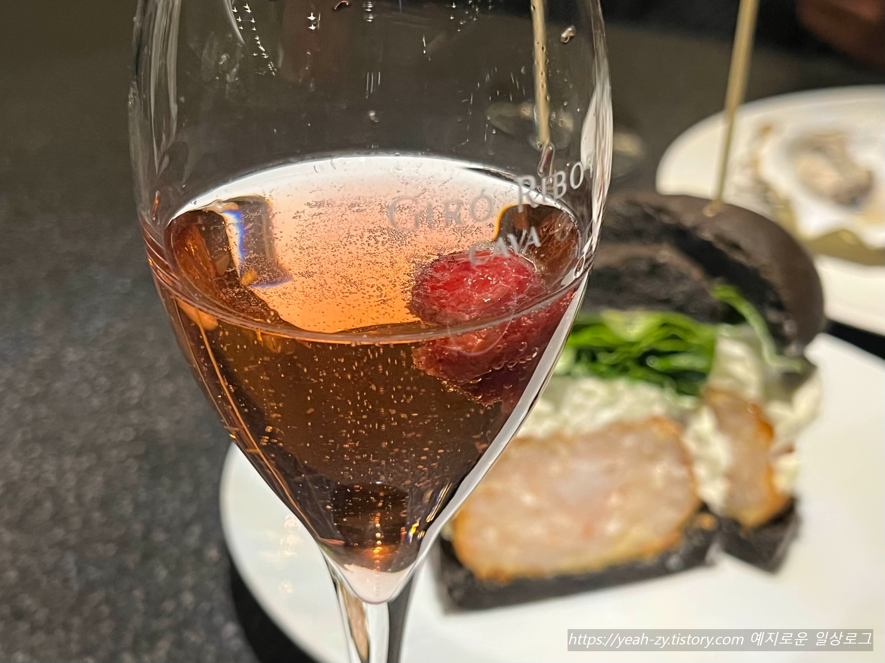 산딸기가 들어간 예쁜 색감의 샴페인 한 잔을 서비스로 준비해 주셨어요