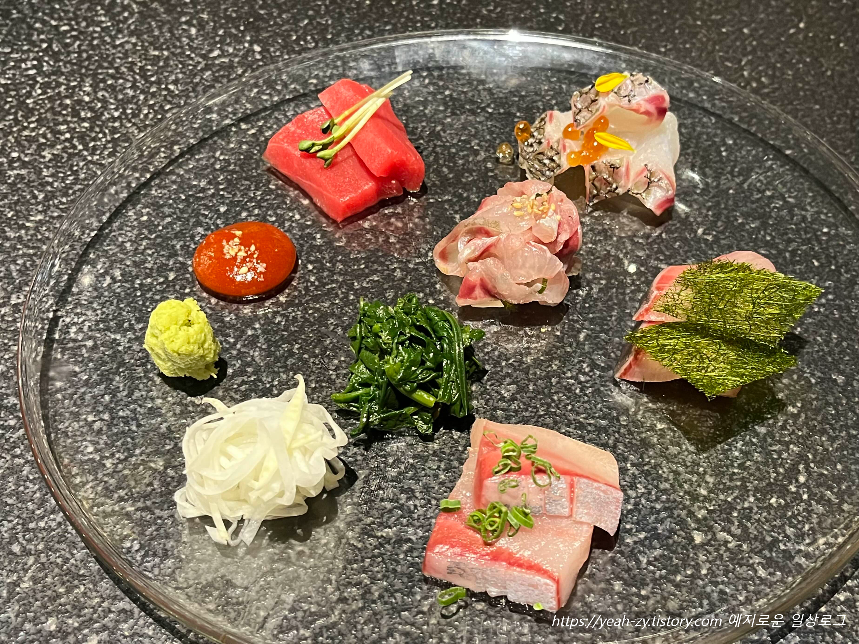 모든 메뉴는 한 플레이트 2인 기준이고, 참다랑어 / 방어 / 밀치 / 참돔 등 각각 두 점씩 올라갑니다