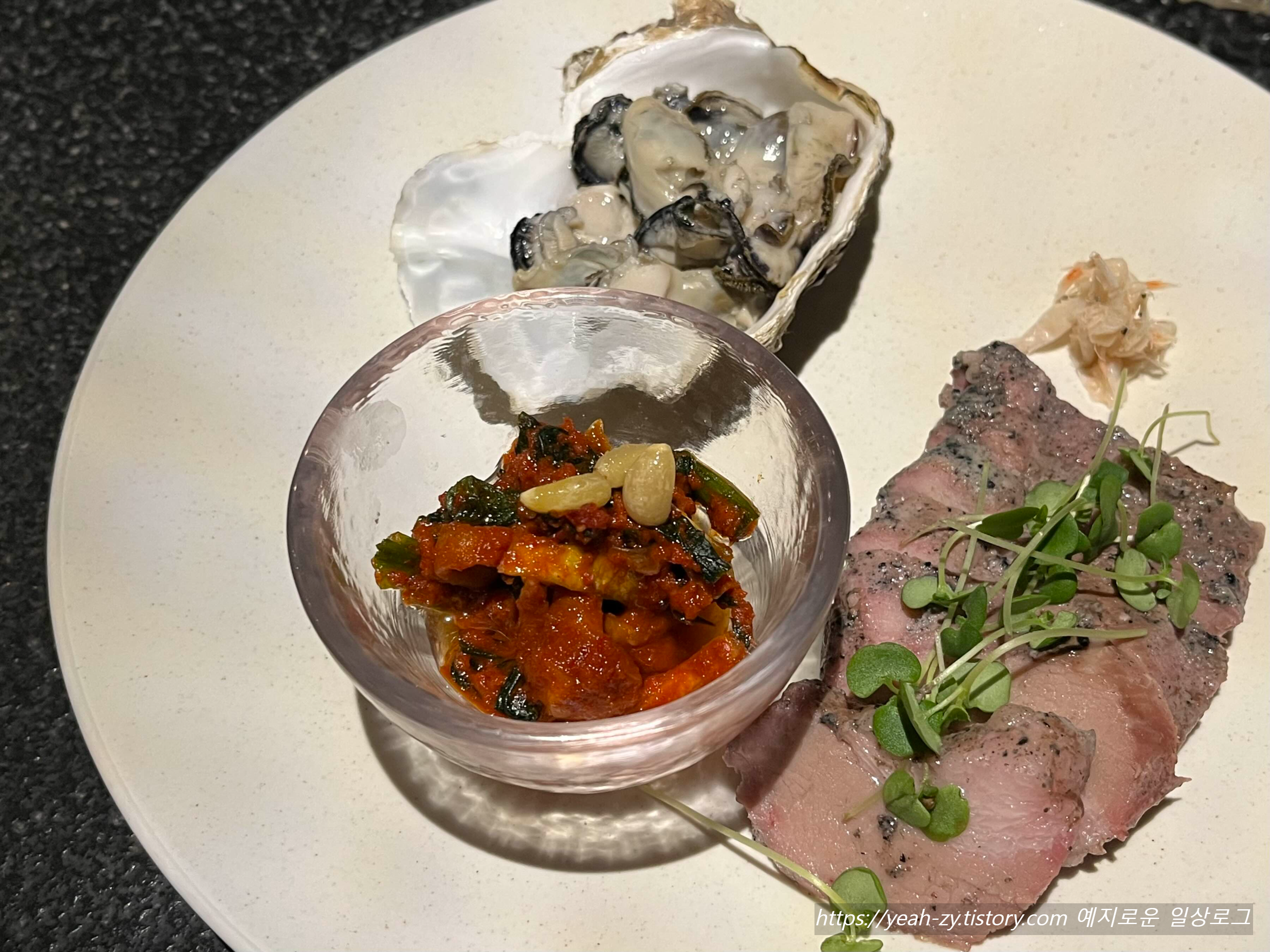 이번 코스는 겨울이 제철인 싱싱한 굴 + 한돈 가브리살 + 무김치를 같이 먹는 굴 보쌈 메뉴🦪
