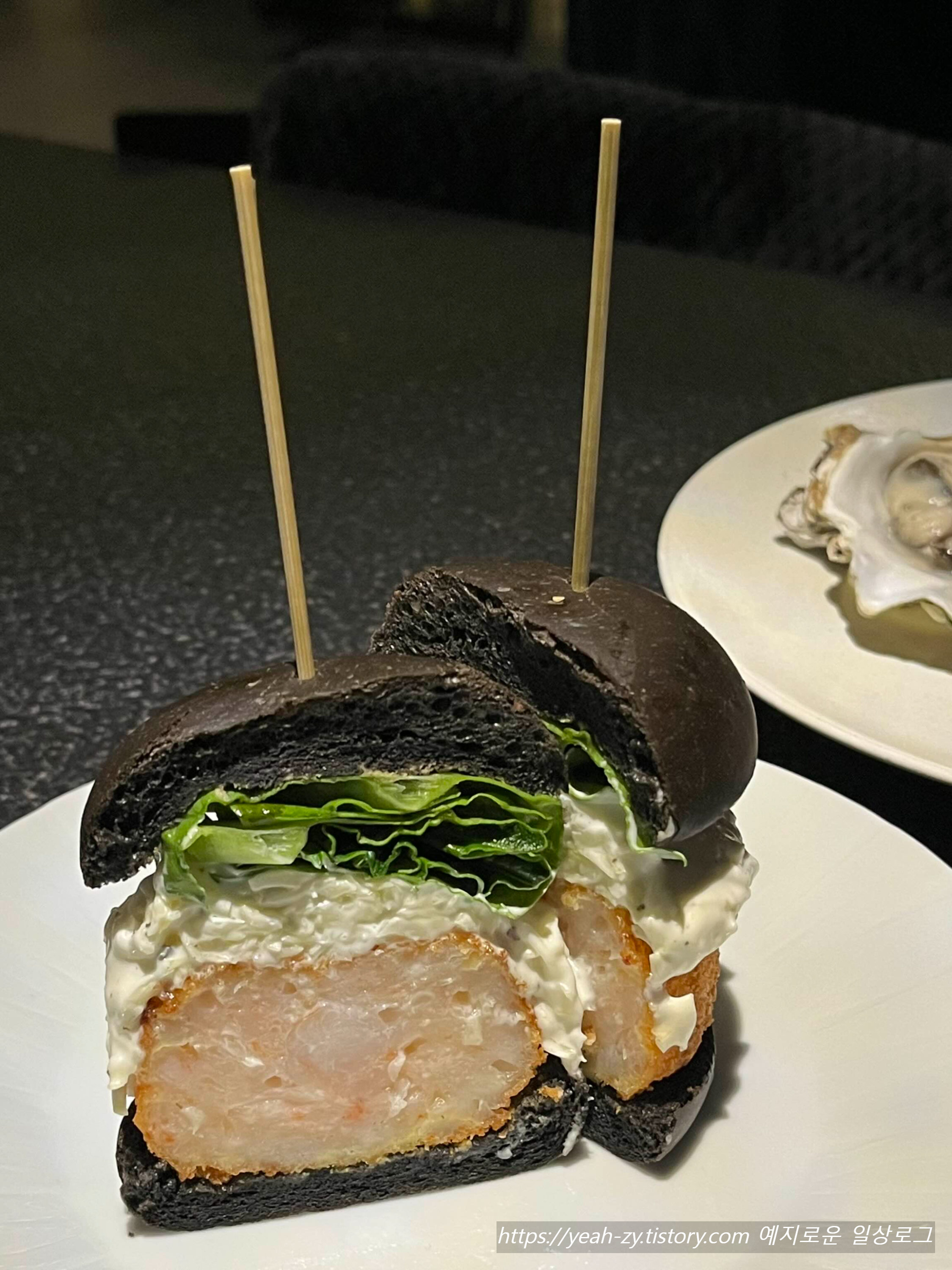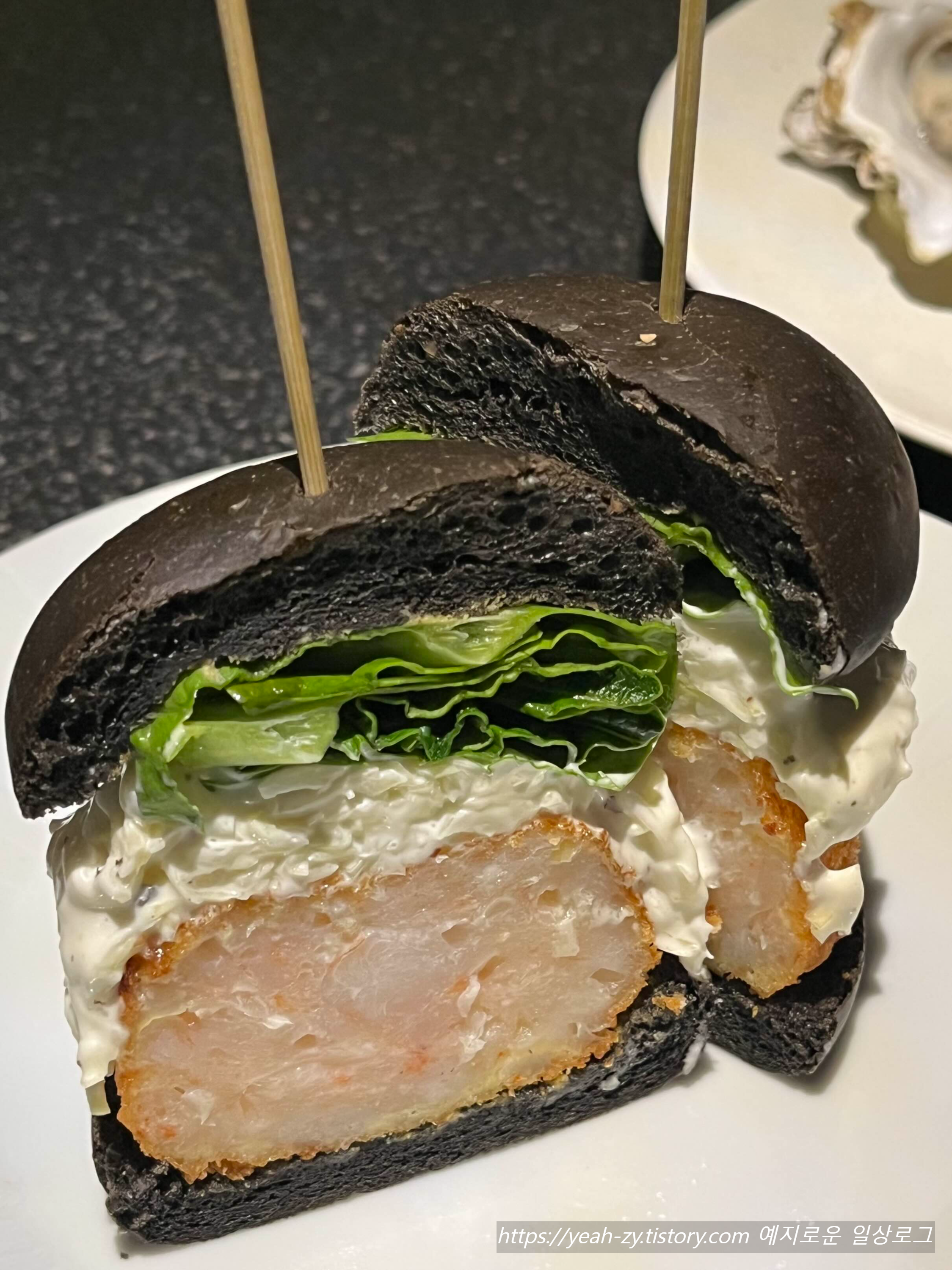 오늘 식사코스의 대미를 장식하는 두꺼운 패티의 새우버거