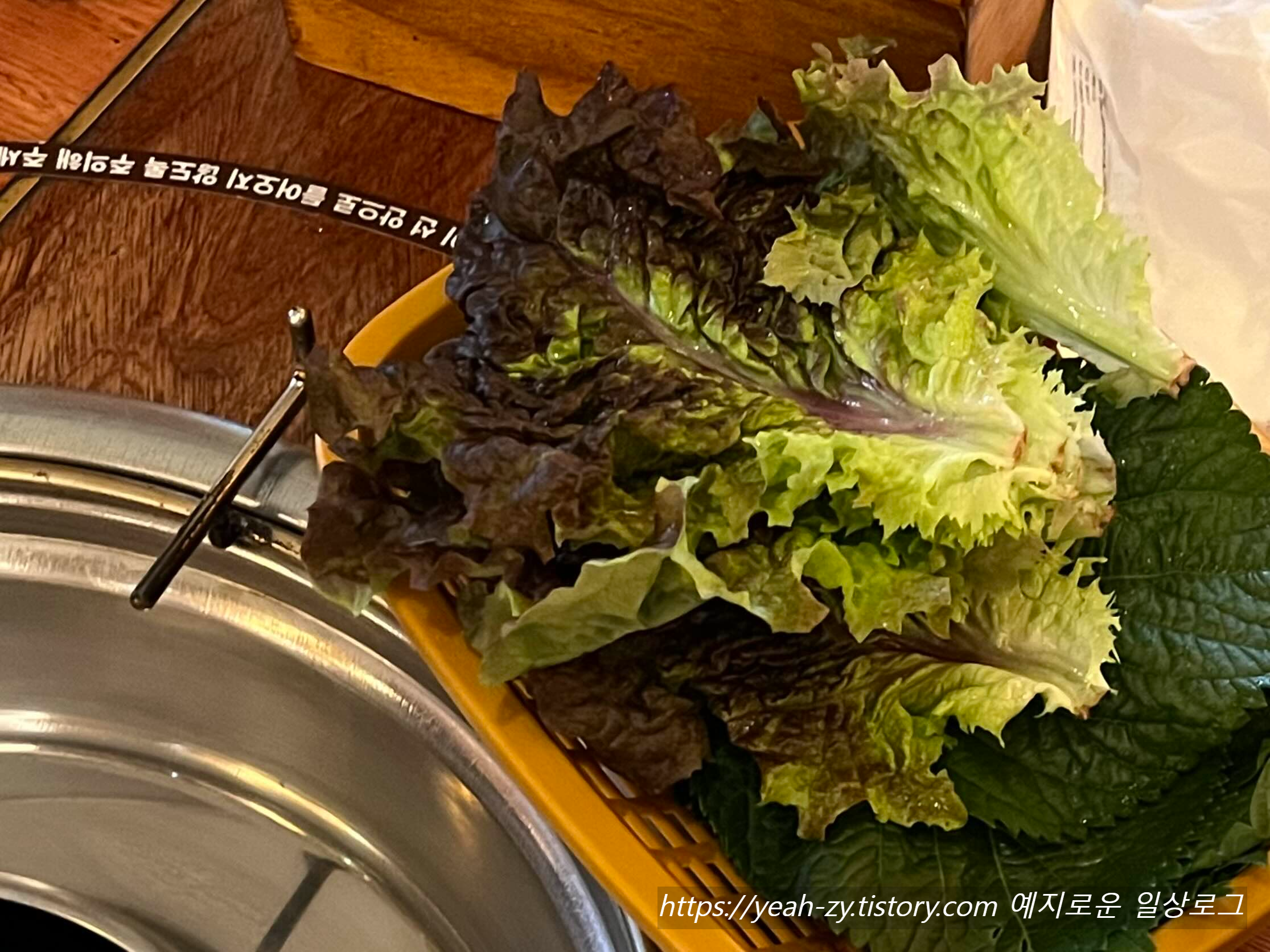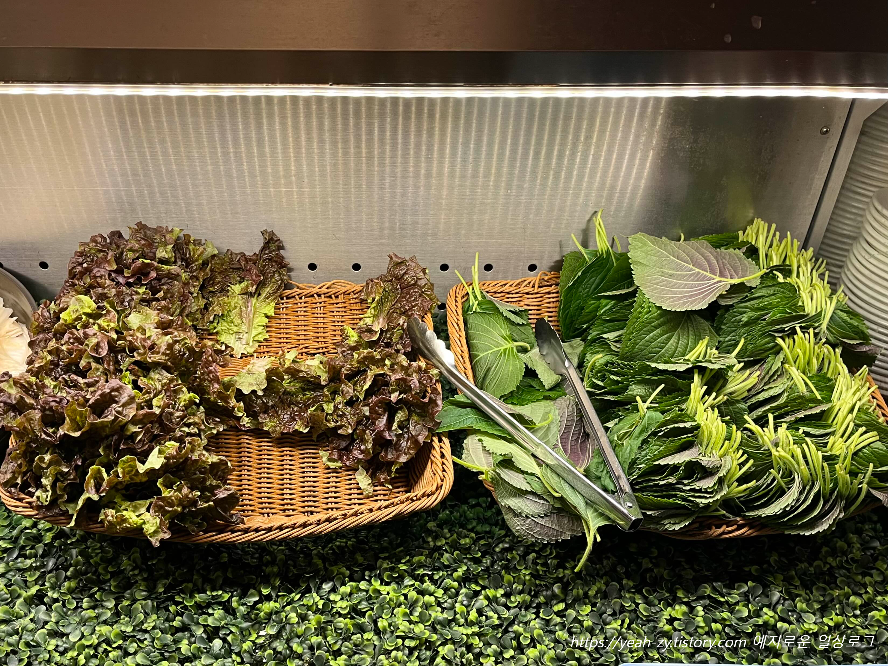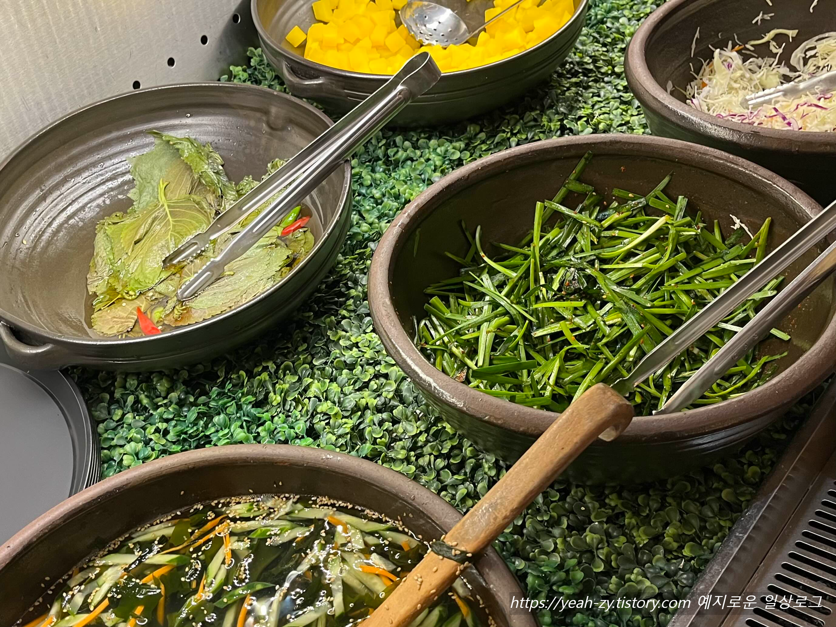 쌈 채소가 신선하게 관리되고 있어서 좋았고, 오이냉국 / 부추 / 깻잎장아찌 / 백김치 등 종류가 다양해요.