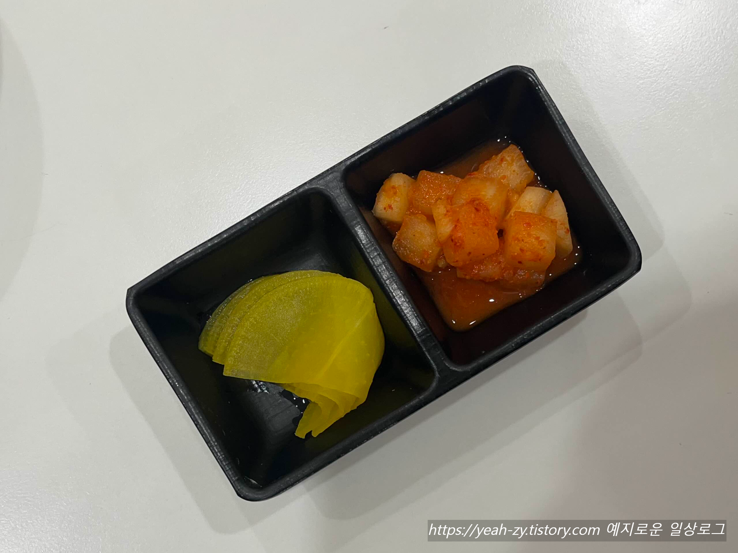 기본 반찬은 단무지 / 깍두기로 심플하고, 다시마식초 / 보리차 / 종이컵이 준비되어 있습니다.