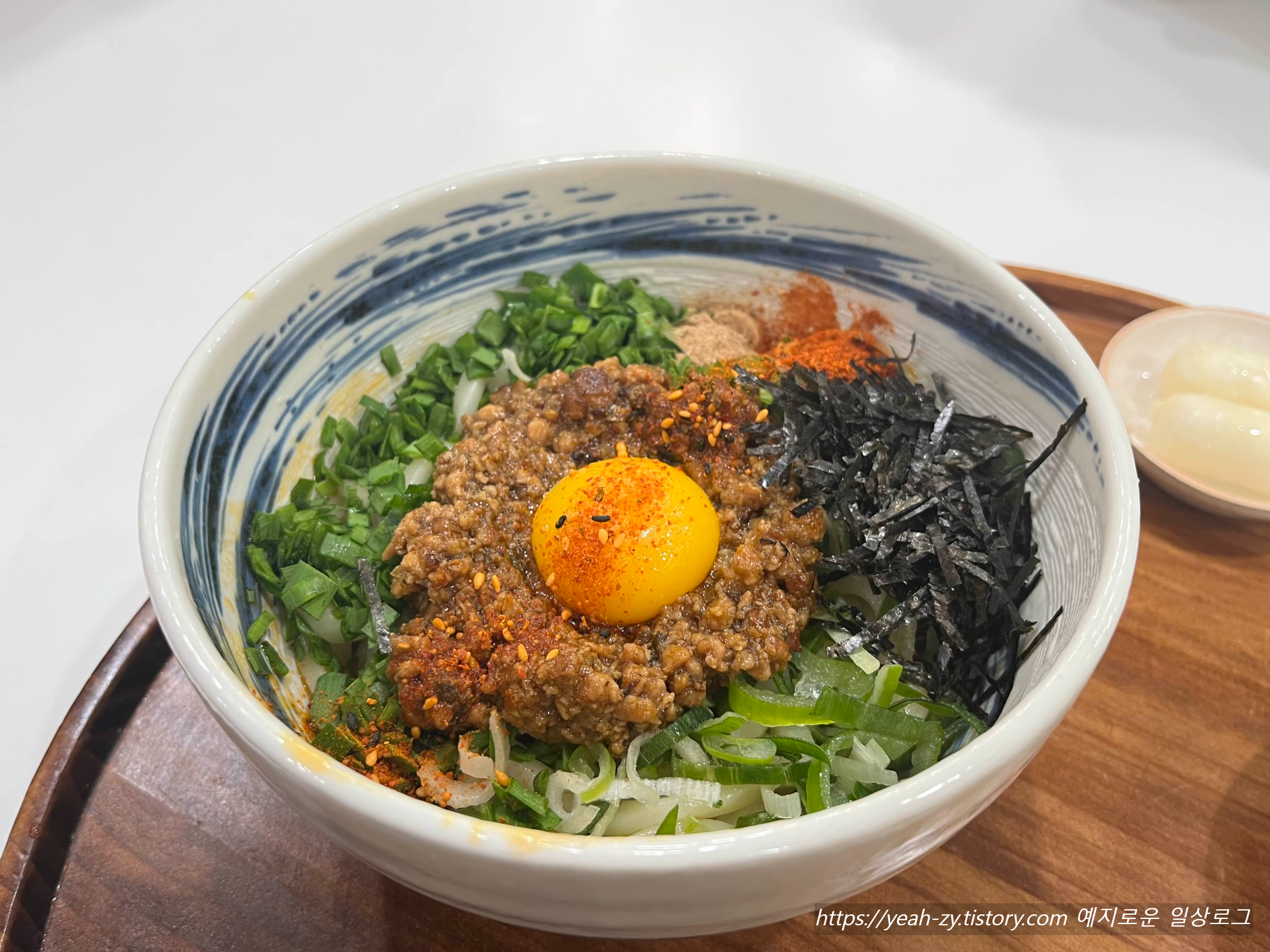 중앙에 올라가는 계란 노른자를 고기 / 대파 / 김 / 우동면 등 모든 재료와 잘 섞어서 드시면 됩니다.