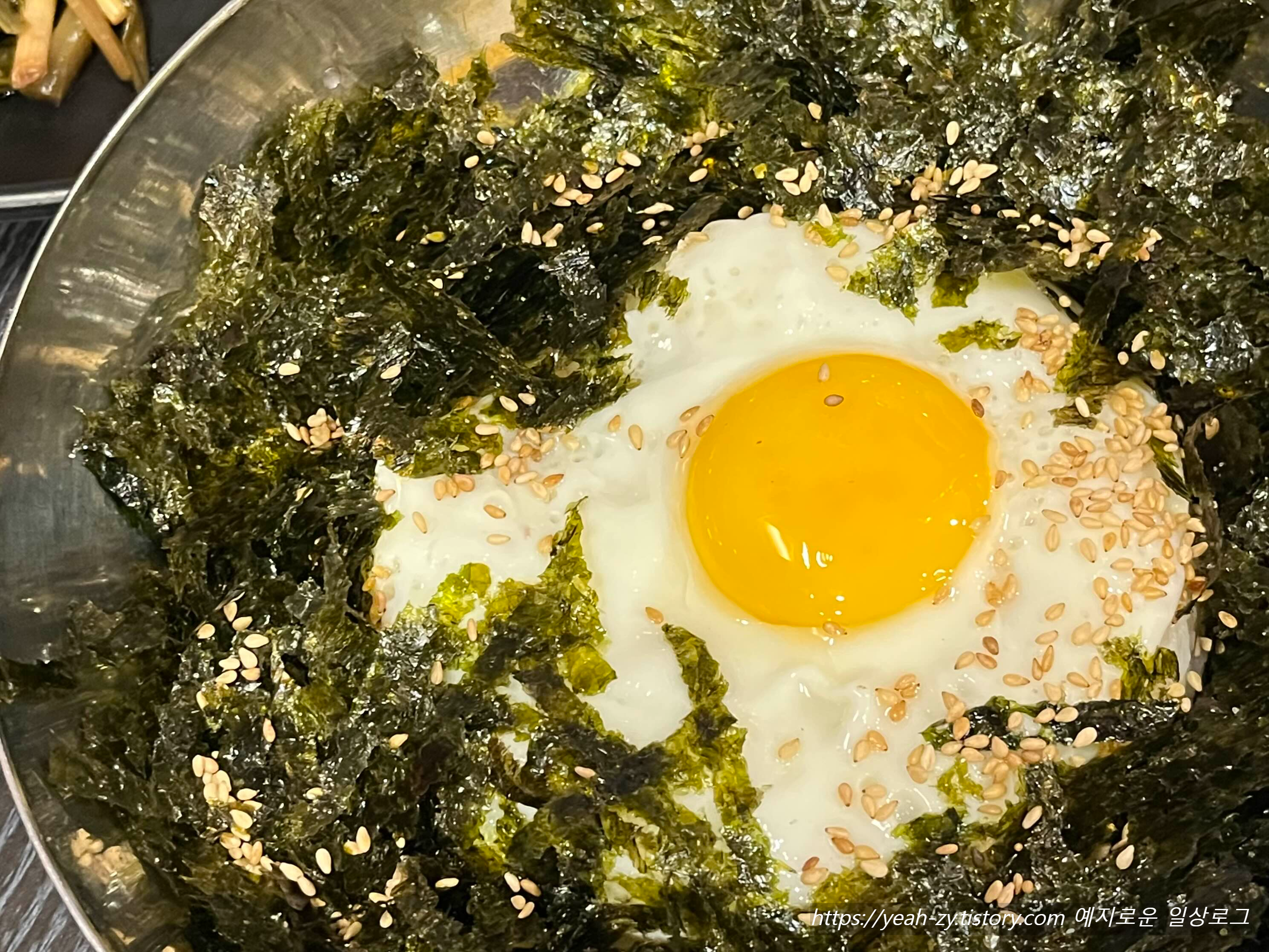 계란밥 사이드로 김가루가 가득 뿌려져 있고, 적당한 반숙까지 완벽해서 맛있게 먹었어요.