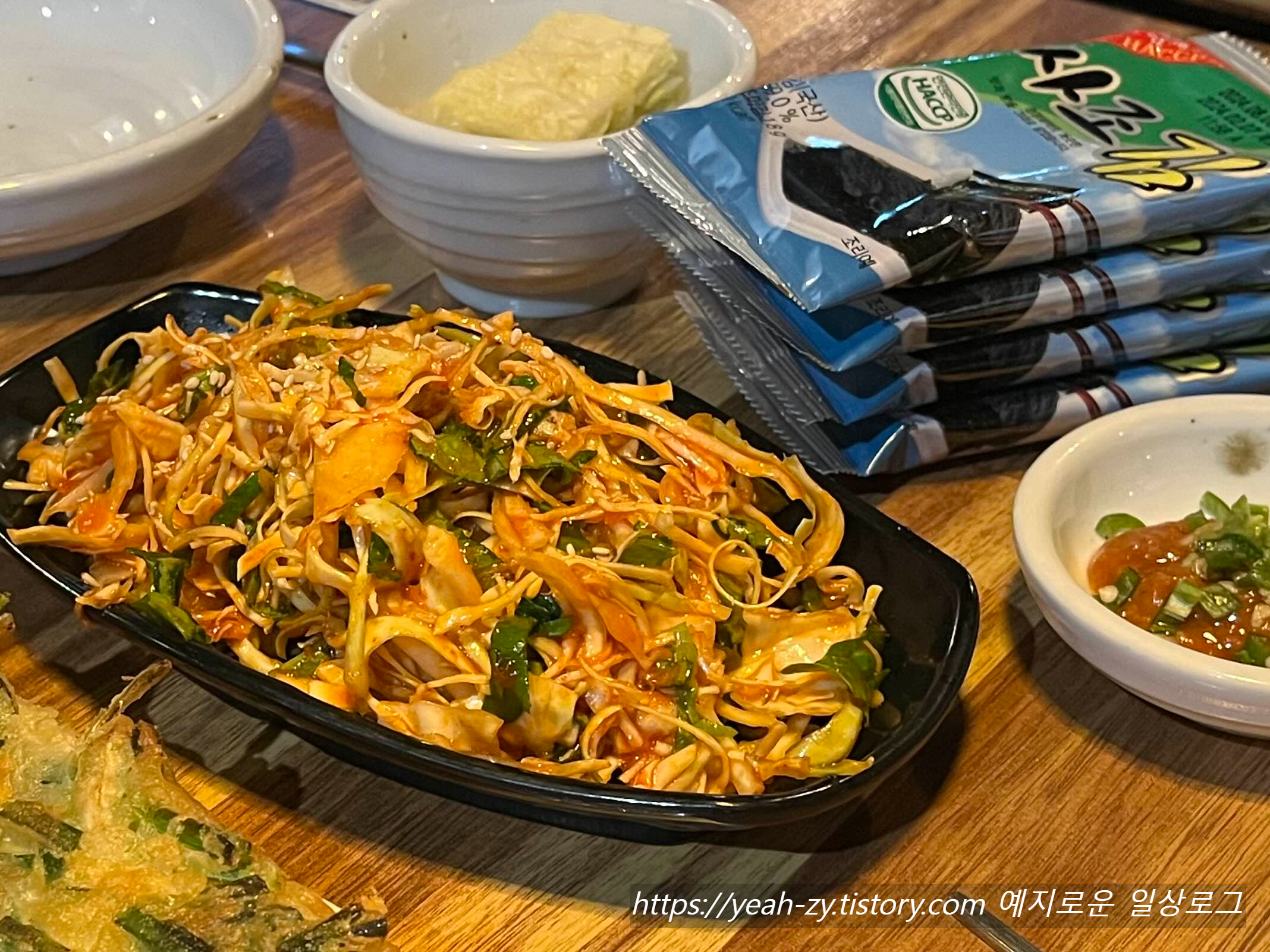 기본 상차림 구성은 소스를 제외하고 야채전 / 야채무침 / 맨초밥 / 조미김 / 백김치