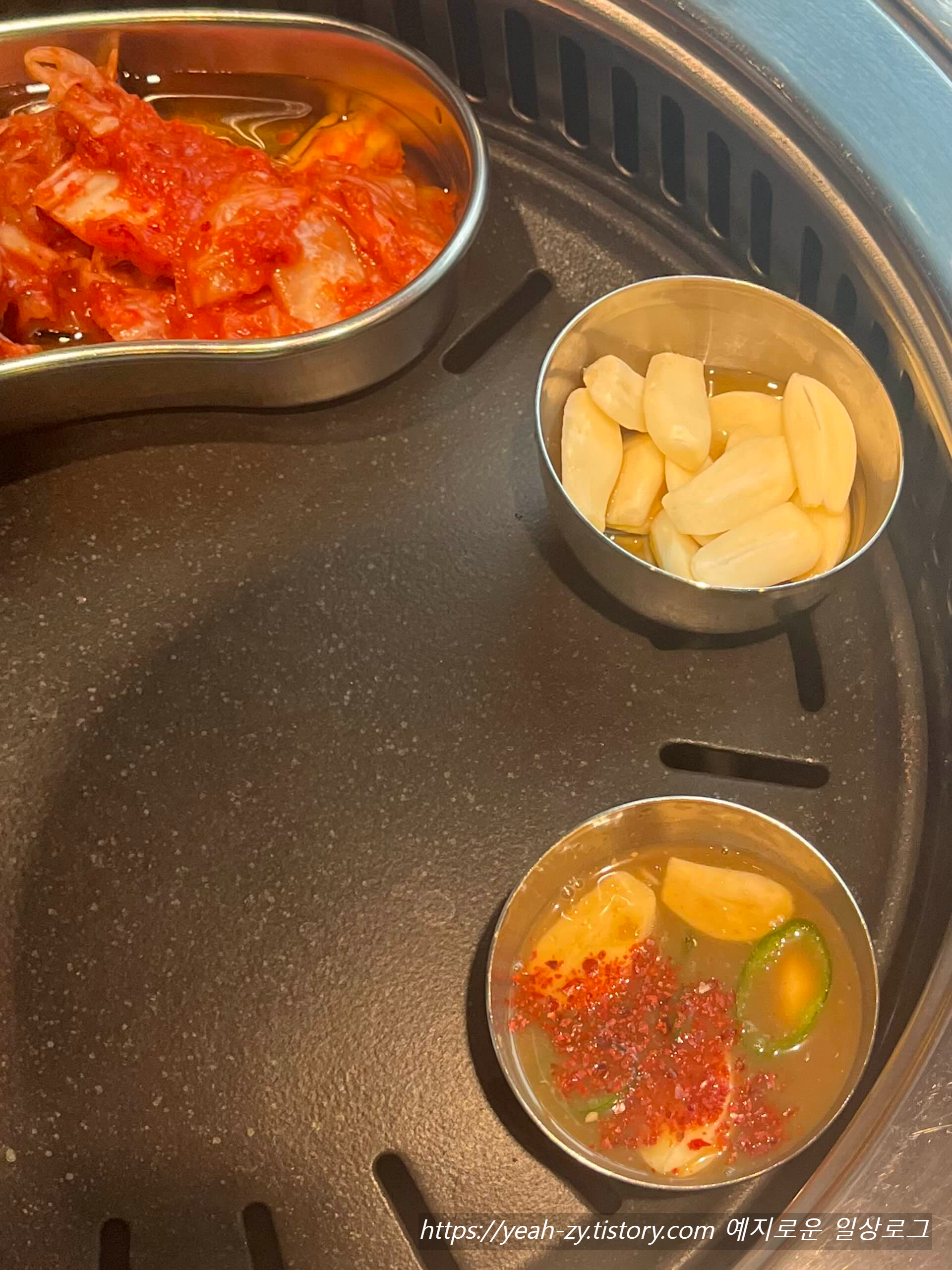 흑돼지 오겹살을 주문하면 불판 위에 김치, 마늘, 멜젓을 세팅해 주십니다.