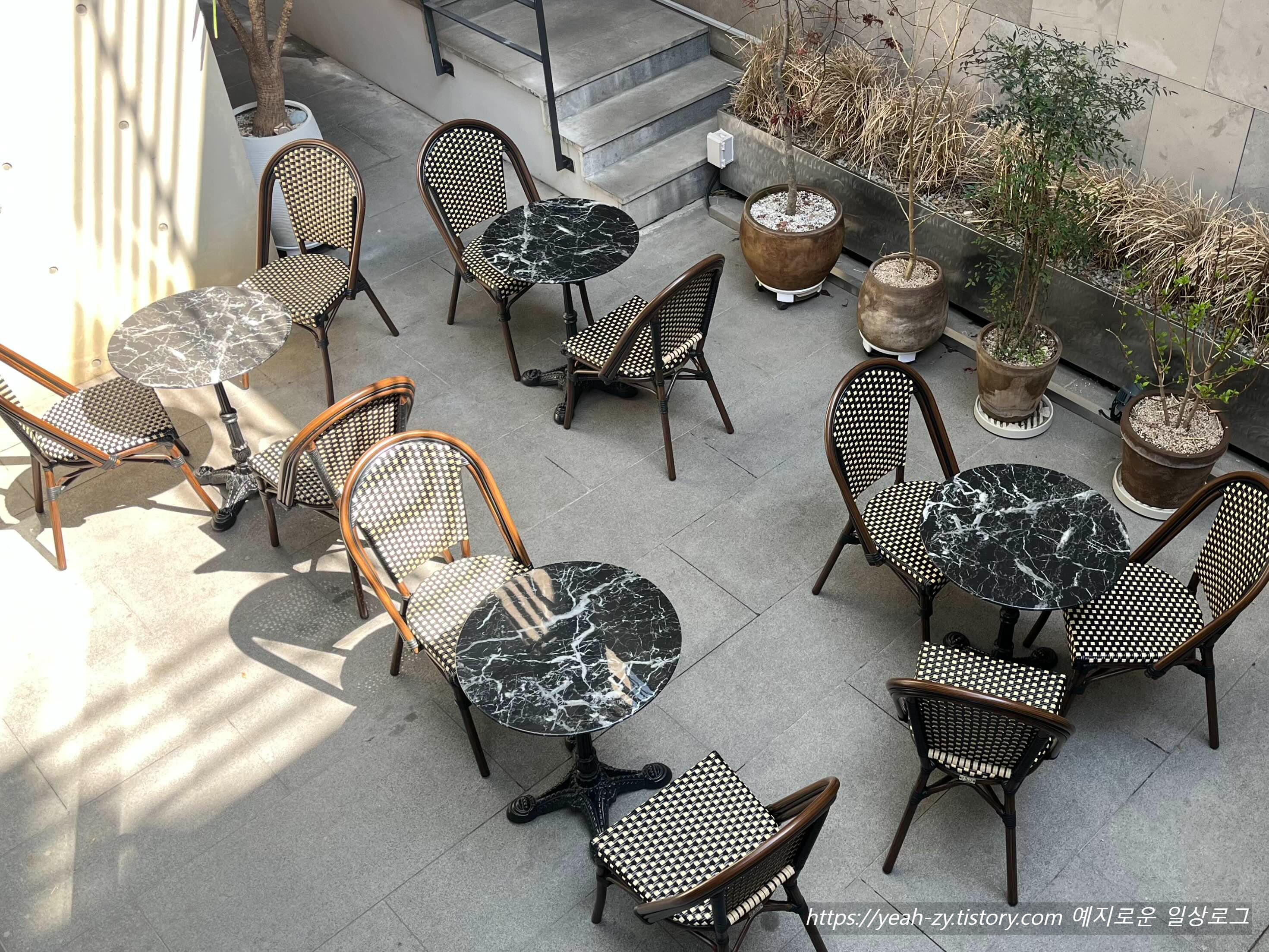 카페로 들어가기 전, 외부 계단을 통해 한층 내려가 보니 넓은 테라스석이 펼쳐집니다.
