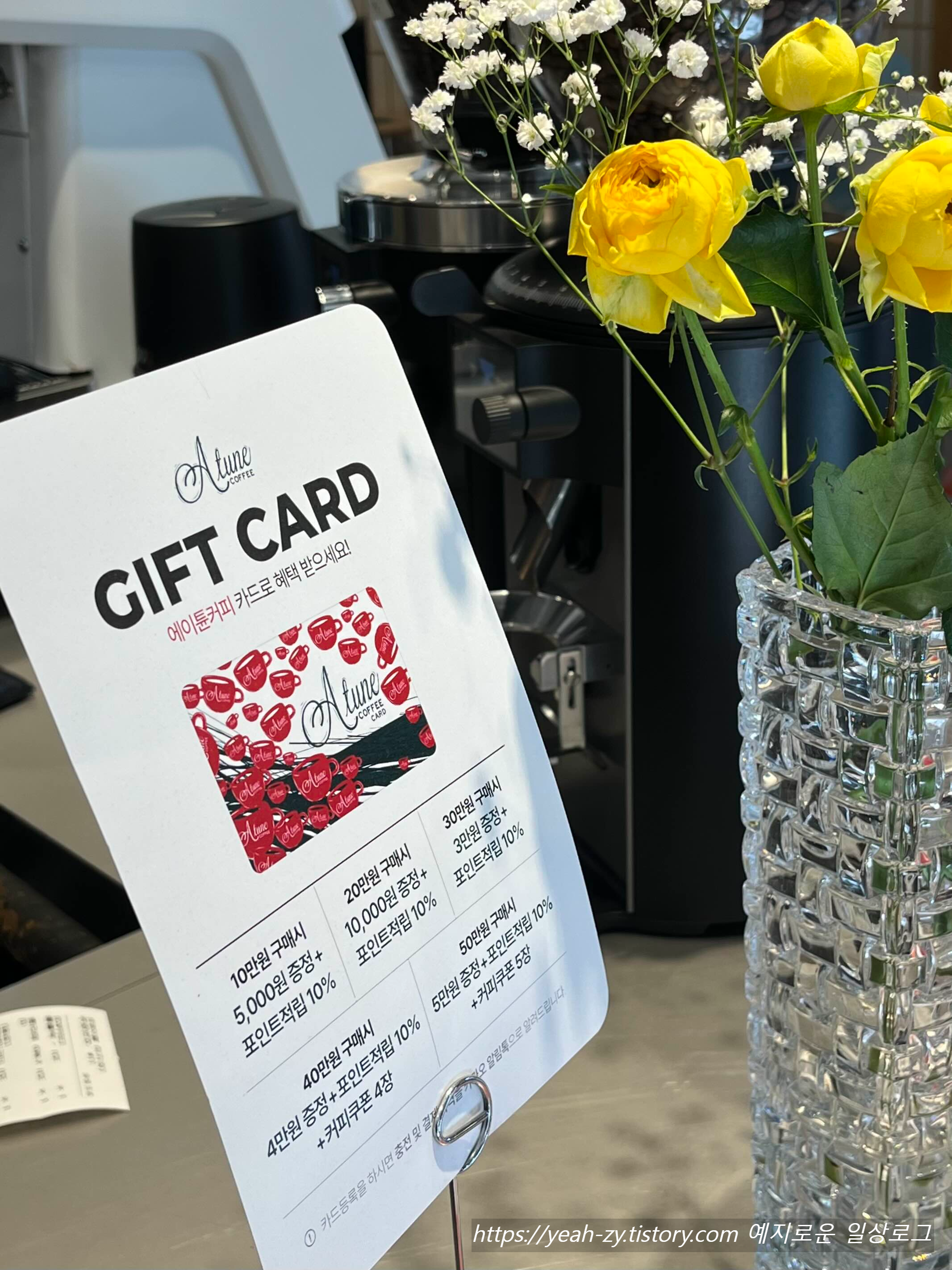 에이튠커피는 포인트 적립이 가능하고 기프트 카드 구입도 가능합니다. 자주 방문하시는 분들께 좋으실 혜택