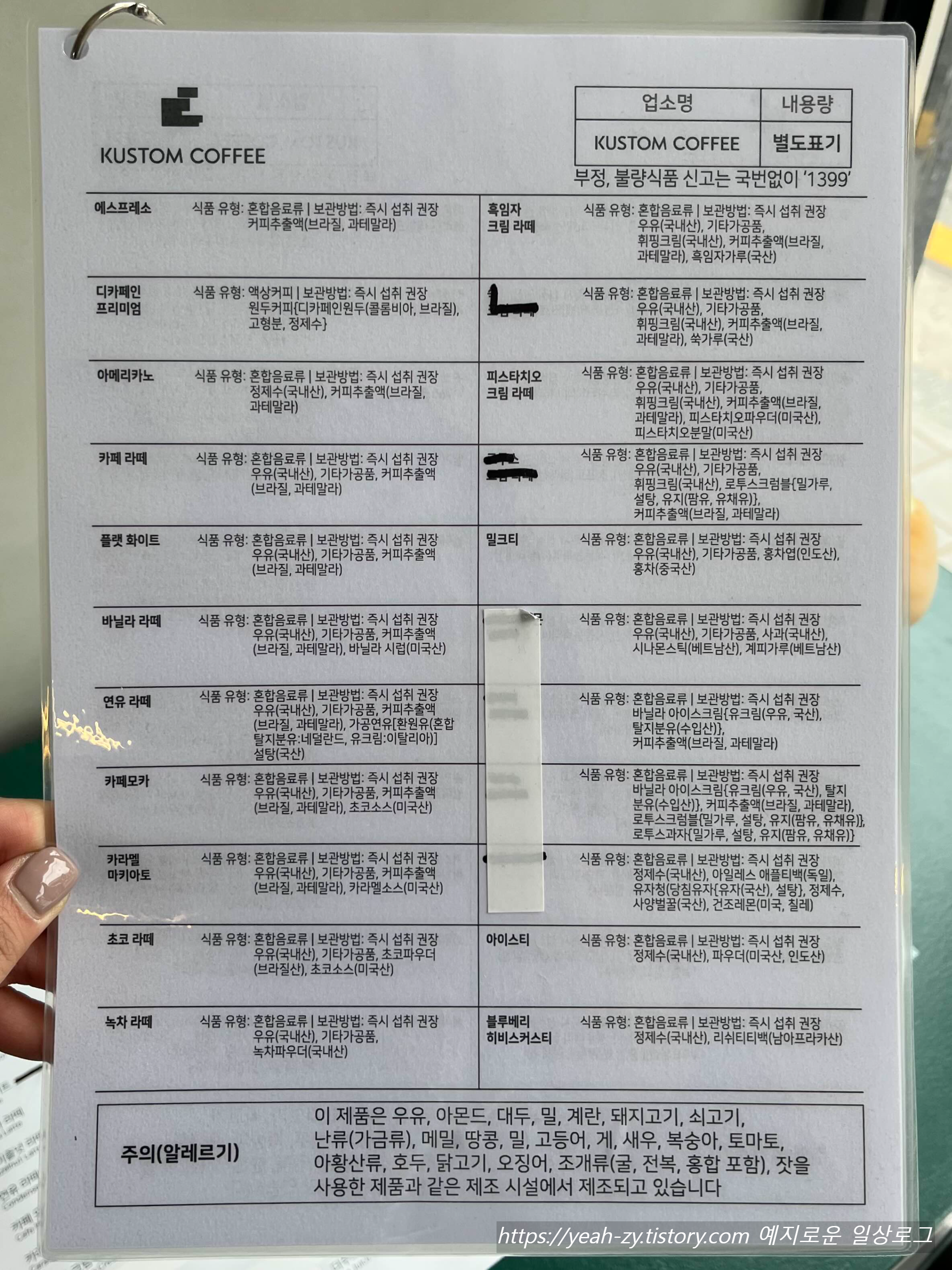 커스텀커피처럼 메뉴별로 꼼꼼히 표기되어 있는 곳은 처음 봐서 신기하더라고요. 세심해서 좋았어요.💯