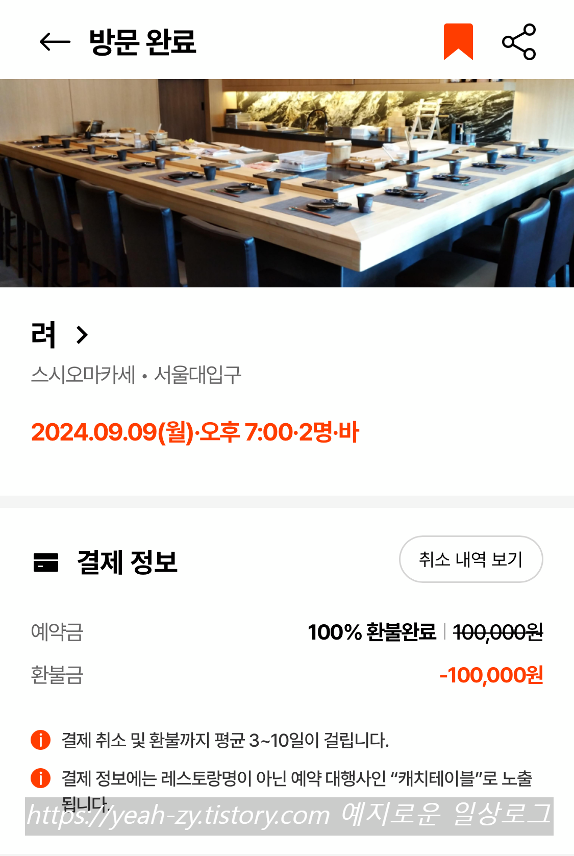 저는 캐치테이블로 예약하고 방문했어요. 예약금은 인당 50,000원이고 방문 확인 후 바로 환불 처리 됩니다.