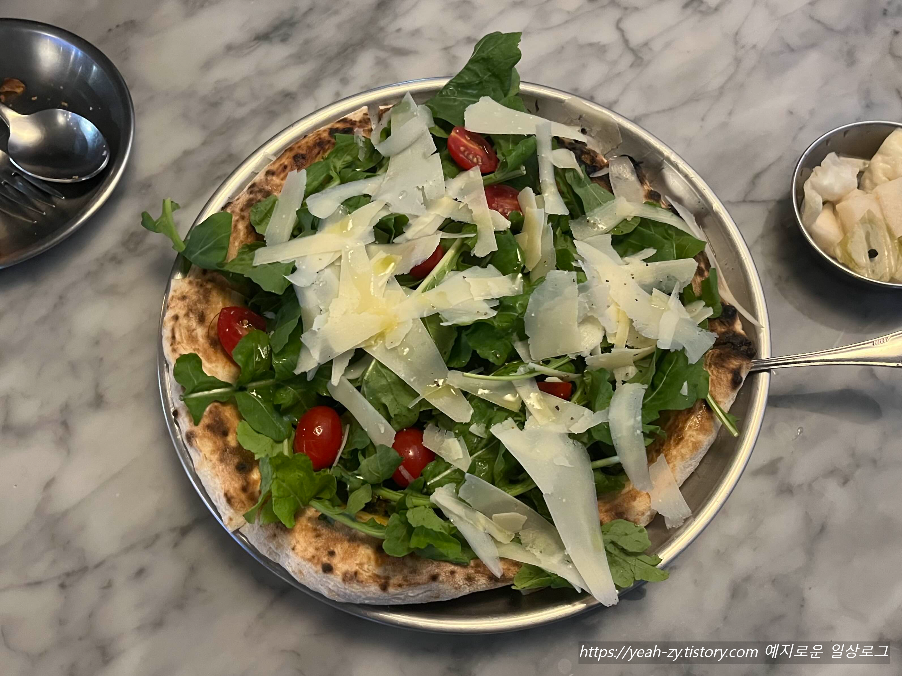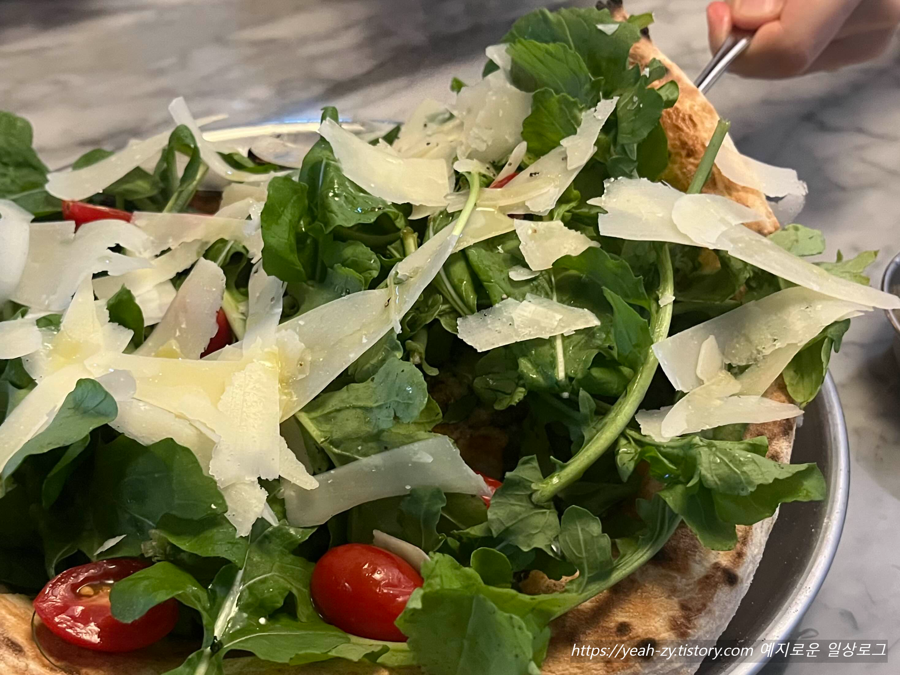 얇은 도우에 치즈, 토마토, 루꼴라, 바질 토핑이 아낌없이 잔뜩 올라가요. 부담 없이 건강한 맛이라 좋았습니다.