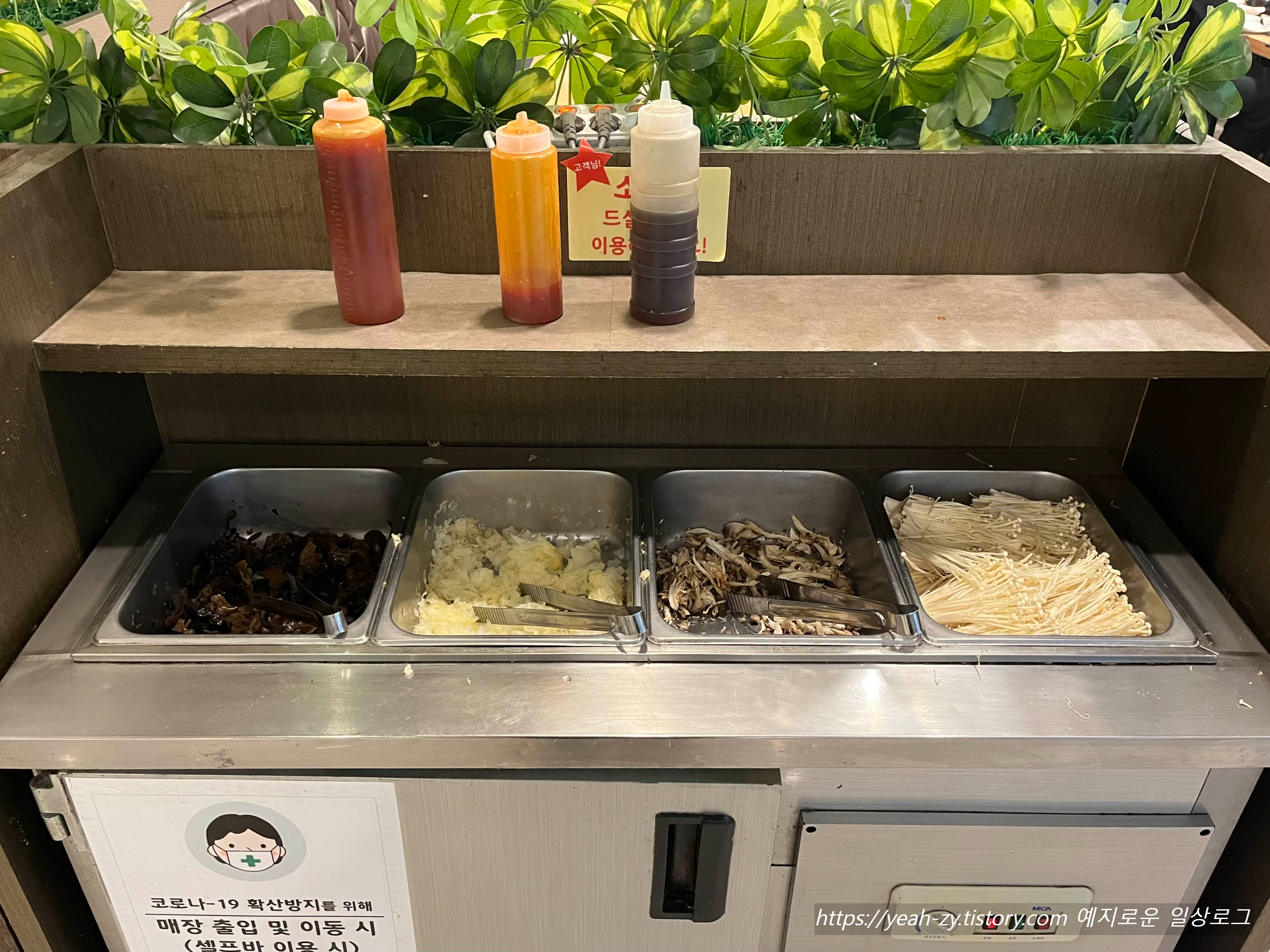 가장 중요한 셀프코너는 밑반찬과 버섯, 야채, 육수, 소스 구성으로 심플해요.🥬