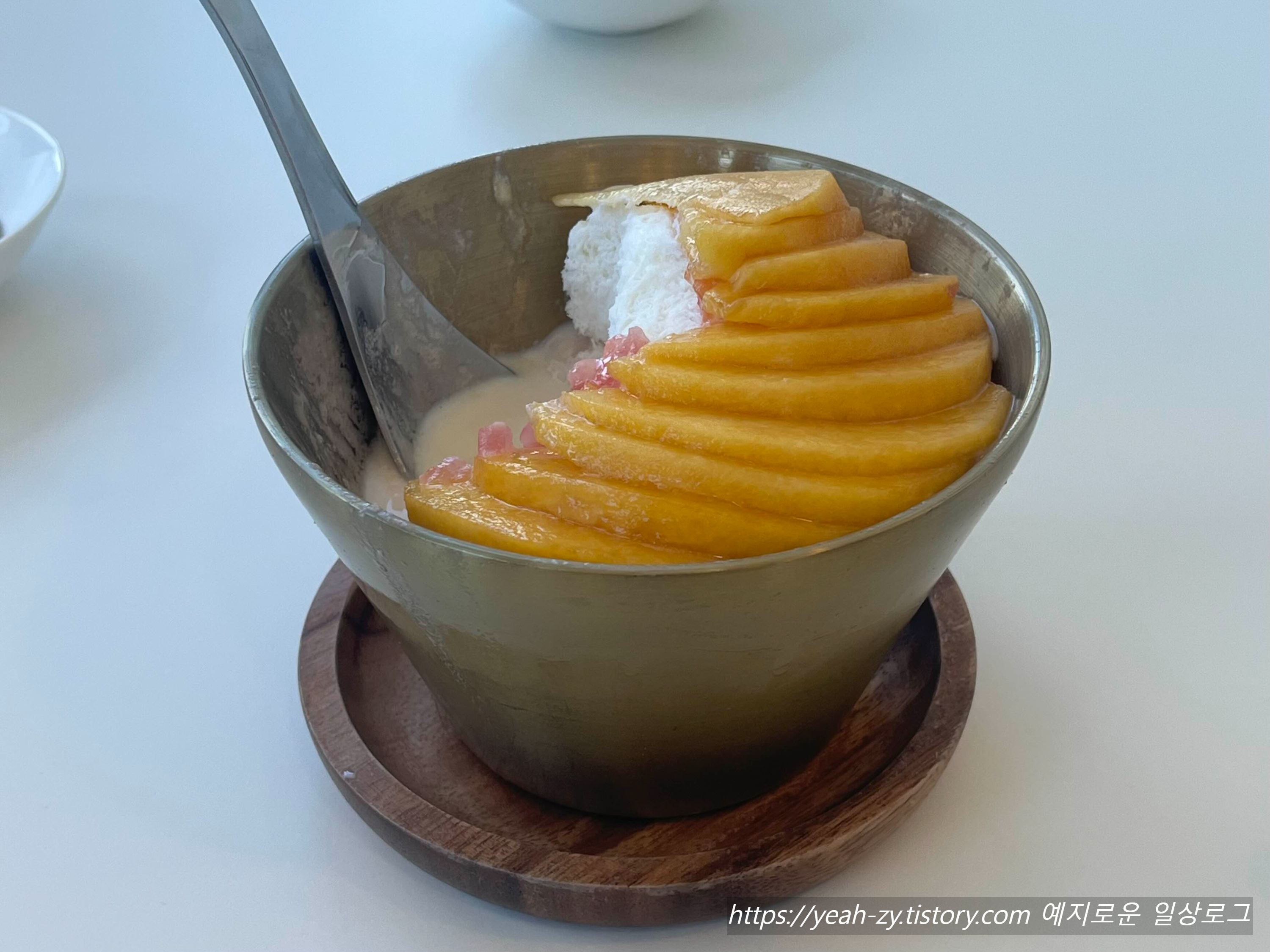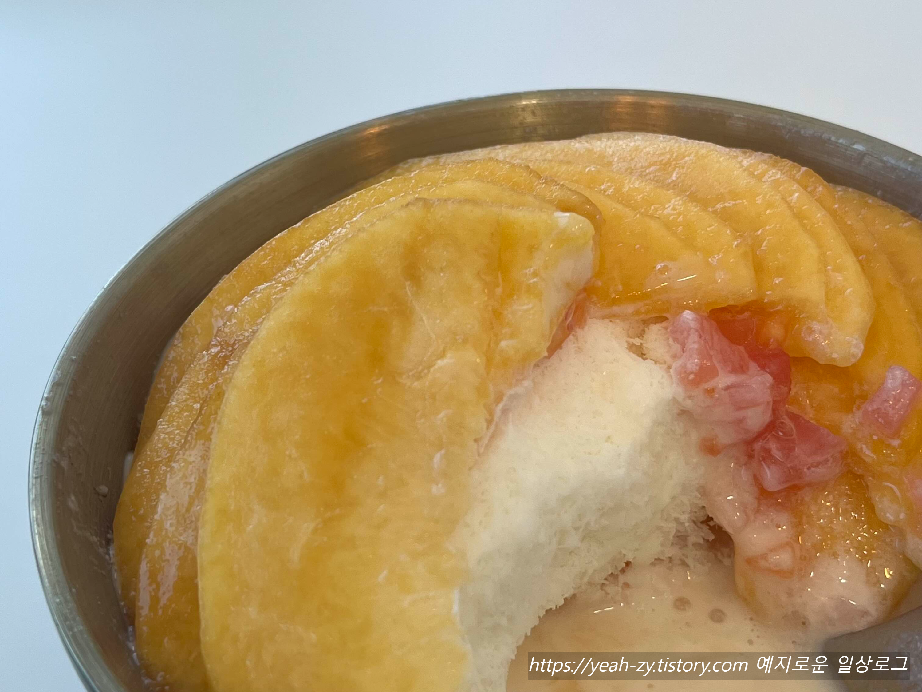 얼음 빙수가 아닌 우유 빙수라서 복숭아 맛 아이스크림 같아요. 요맘때 좋아하시는 분들은 극호일 듯🍨