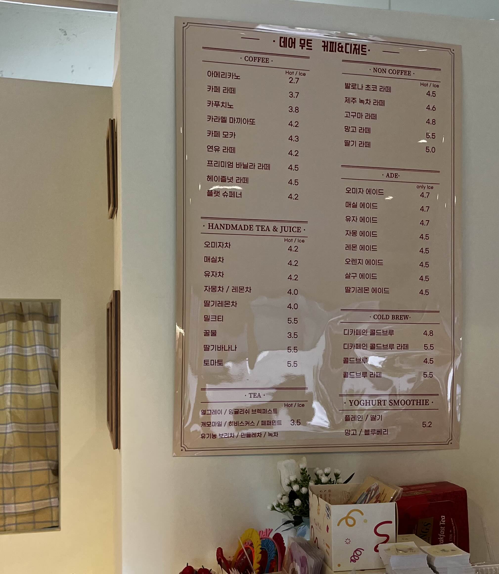 데어 무트에서 판매 중인 전체 메뉴 모습입니다