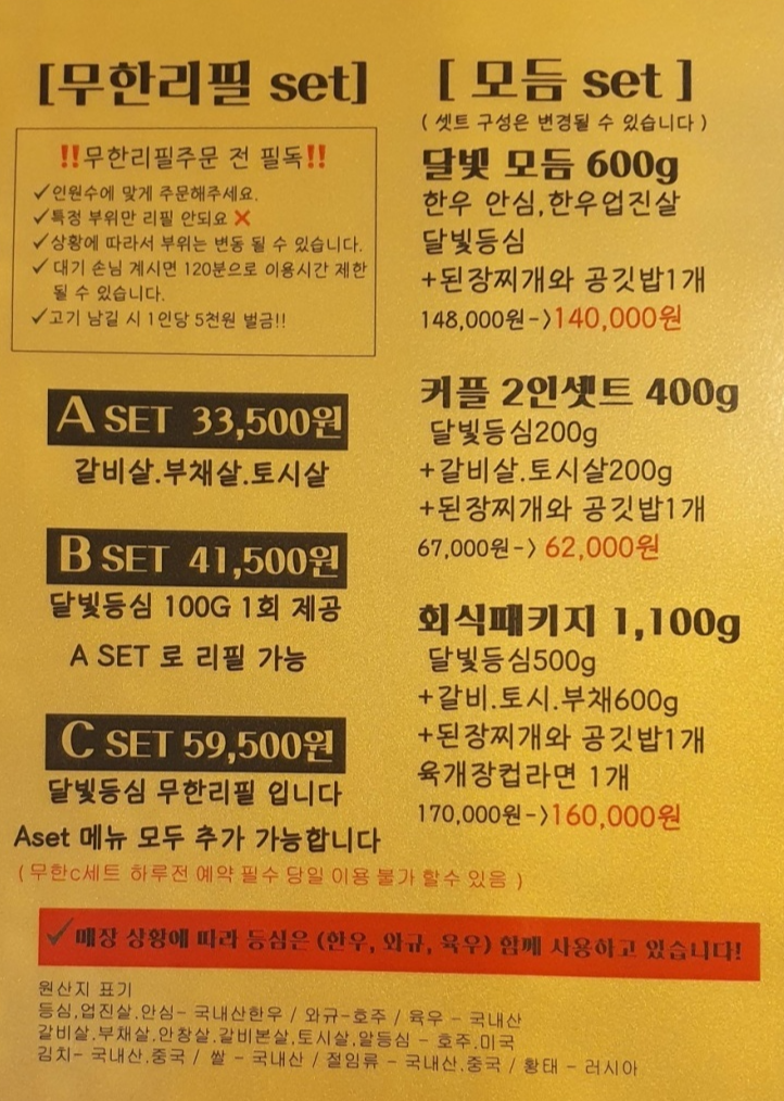 달빛화로의 메인 메뉴인 두 가지 무한리필 세트 메뉴의 가격이