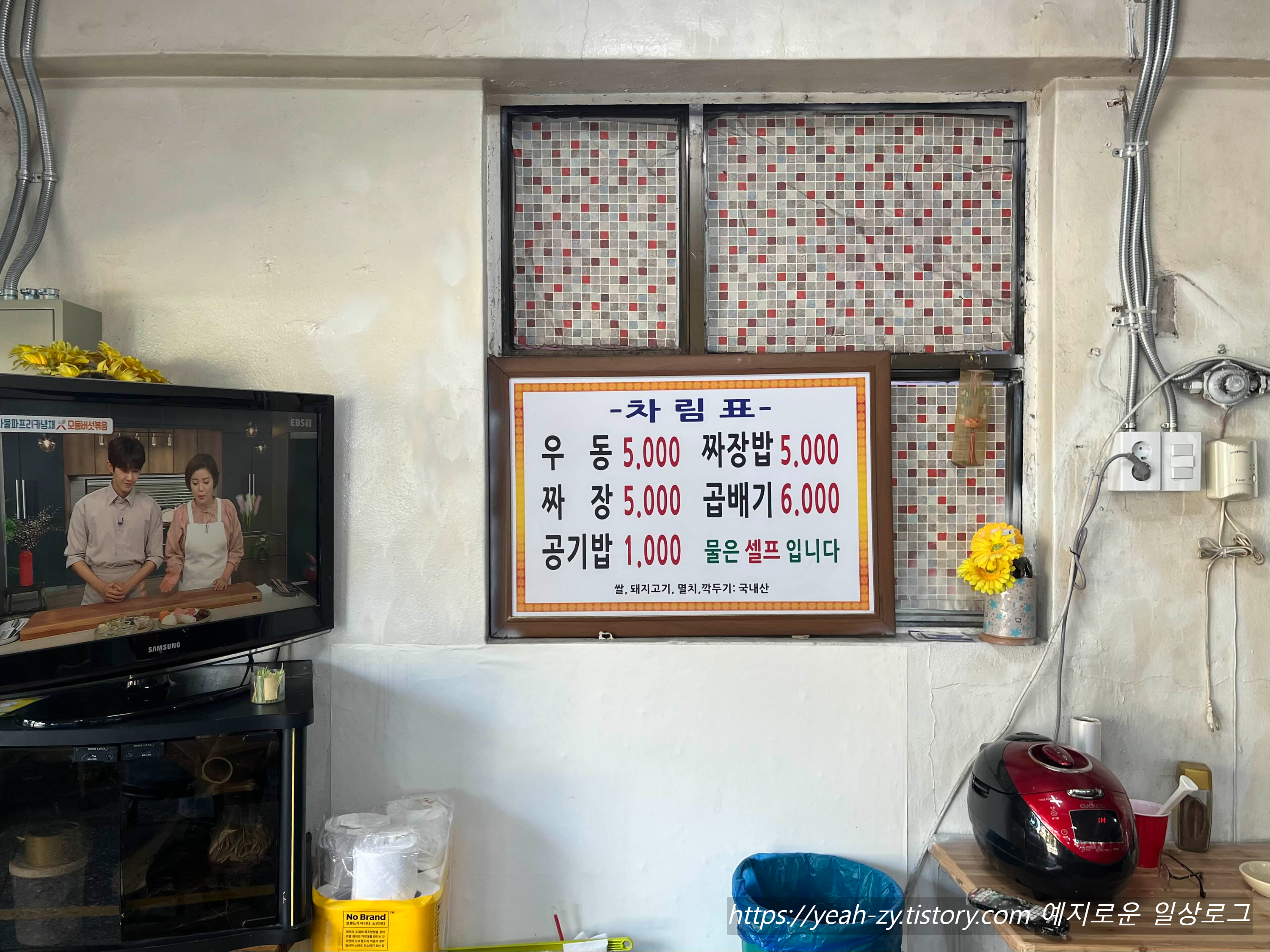 기계우동 메뉴는 우동 / 짜장면 / 짜장밥 딱 세 종류로, 가격은 모두 5,000원 통일입니다.