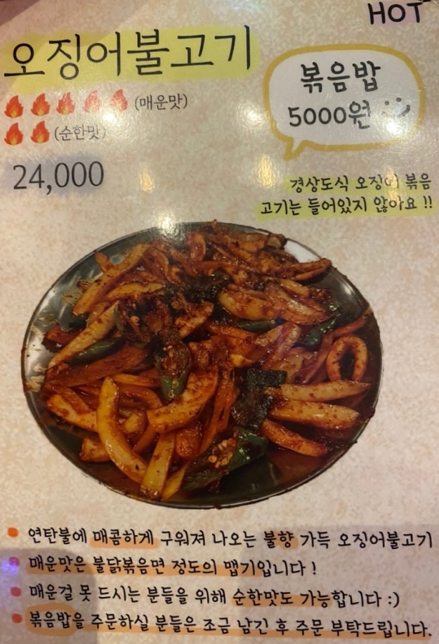 불공장의 오징어 불고기 메뉴는 매운맛 조절이 가능합니다